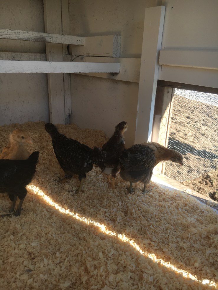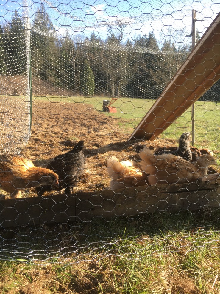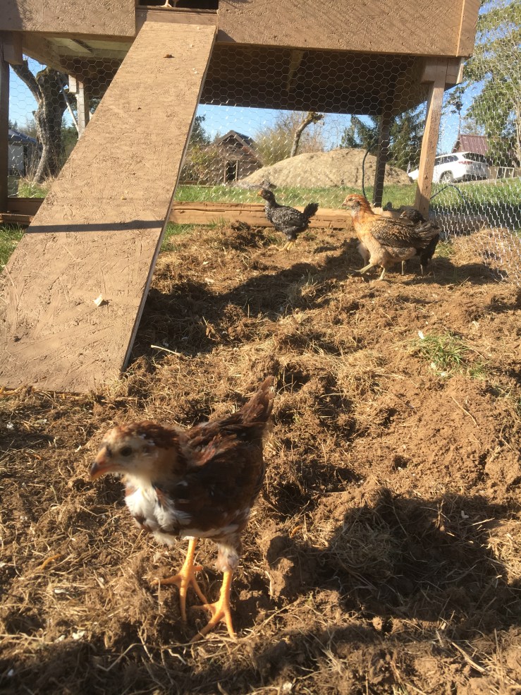A week ago the chicks finally made the big move to The Great Outdoors! It was pretty exciting (and equally scary, we hear lots of coyotes out here – not to mention the bald eagles and hawks that fly over!) The first couple nights I was pretty nervous. But they have done beautifully, we just lock them up tight in the evening and let them out during the day. They seem incredibly happy with the arrangement, though they haven’t learned to go back into the coop at dusk just yet. Too much fun outdoors I suppose! Here is their first time in the coop and then their first move outdoors:
