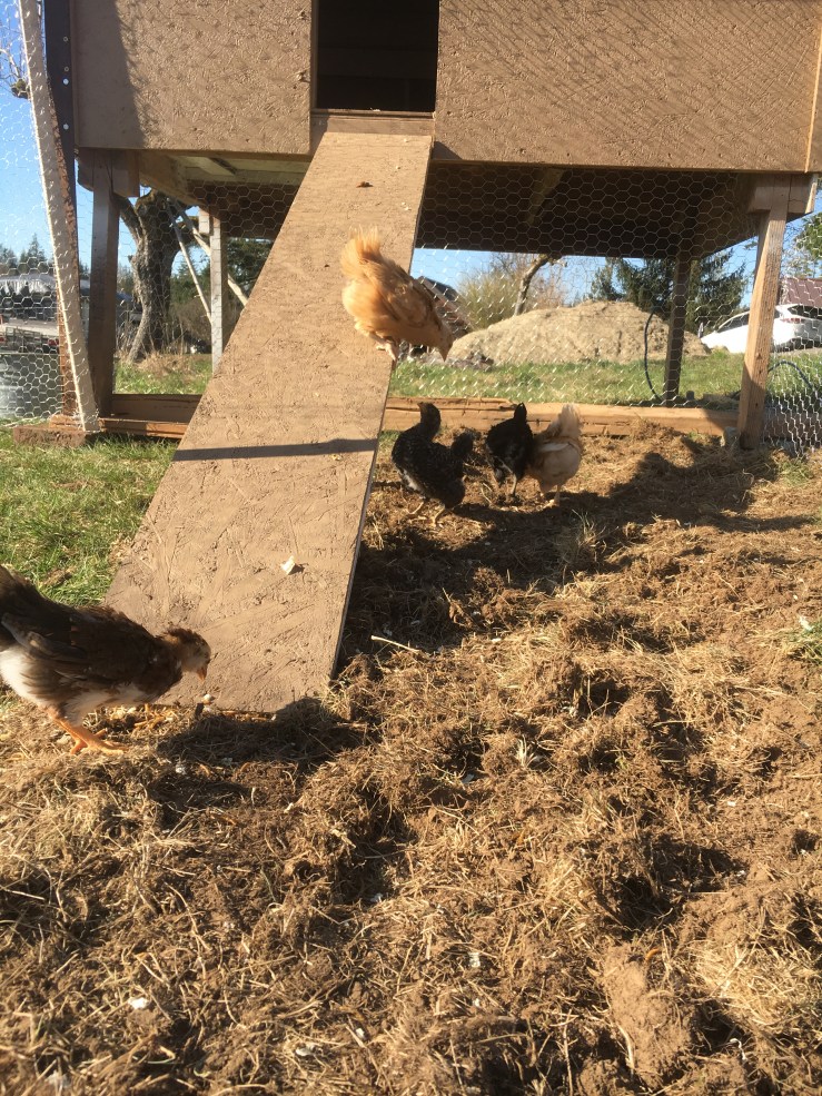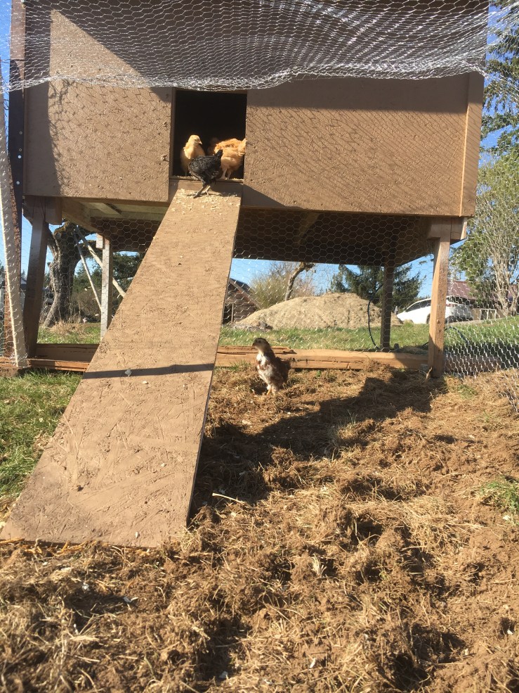 Harriett was the first one out of the coop – and only because she got shoved! The rest slowly followed one by one (though every one but the last came out on accident, by being shoved or by not understanding the ramp was only so wide!) It was pretty fun to watch them start looking for stuff in the ground and realize they were pretty happy with the accidental fall. Goldie was the last to leave the coop, and with no one left to push her, she ended up being the first to leave on purpose.