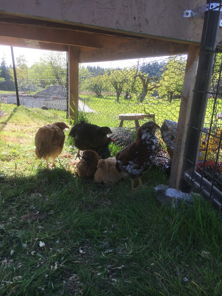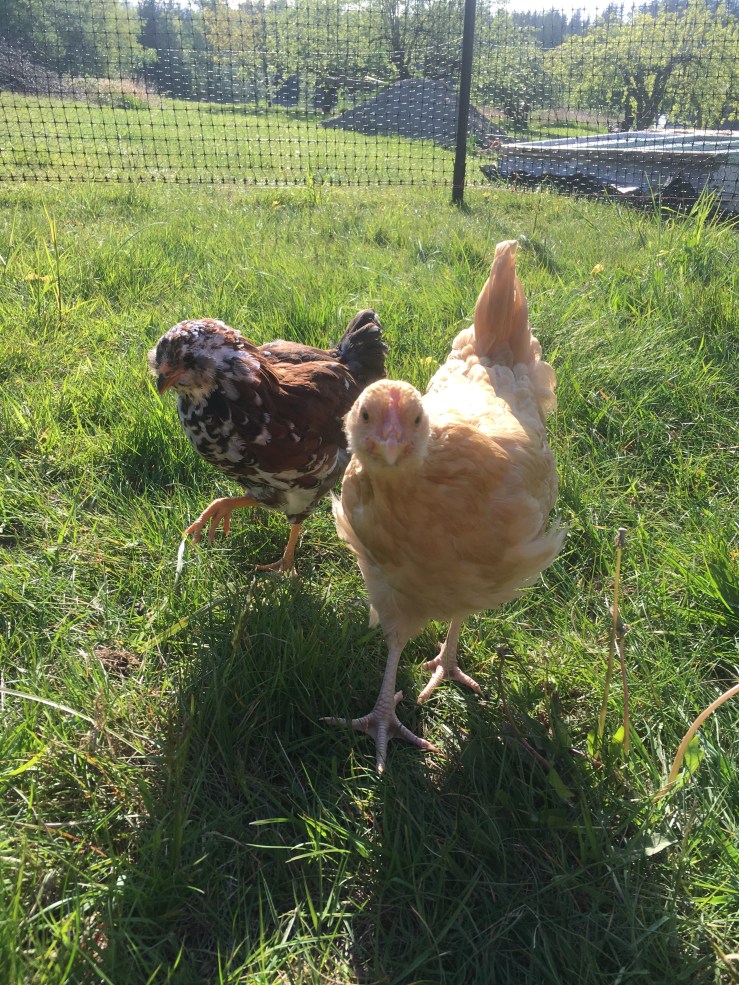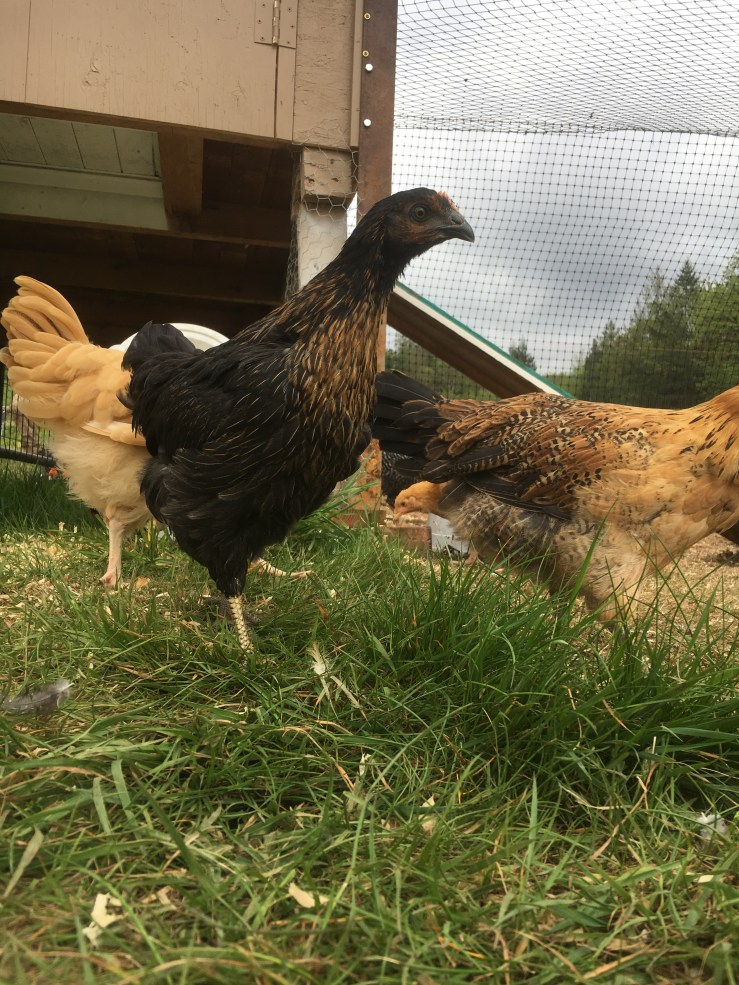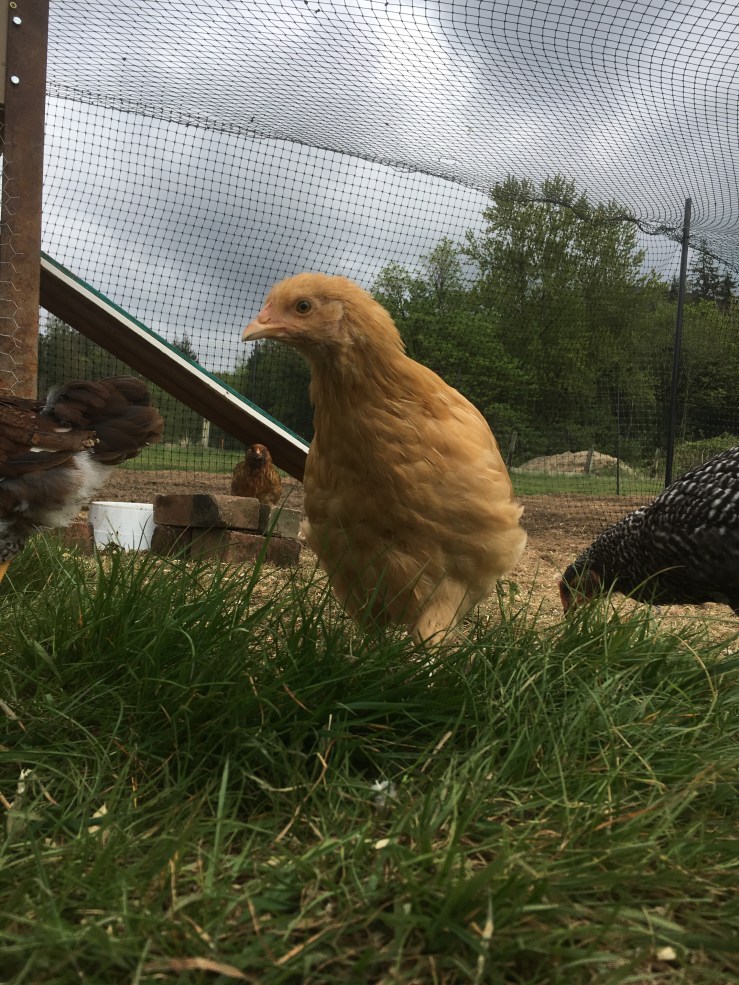 I think the chicks are officially chickens. They’re 9 weeks old and are mostly weaned from the heat lamp – I’m still turning it on at night for them; but that stops this weekend! They also finally got their big run put in this past weekend and they are loving it. People tease me practically daily for being so excited about my chickens, but watching them grow into chickens has been so. much. fun. I feel like I was born for homestead living. Besides the whole bit about murdering your animals for food and all. Hopefully I graduate to being okay with beef cows and pigs because I really do believe growing your own food is a much better option for the animals (and us). I don’t know that I’ll ever be okay with eating my own chickens. But. I will gratefully eat the eggs that they provide!
