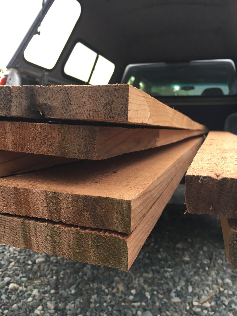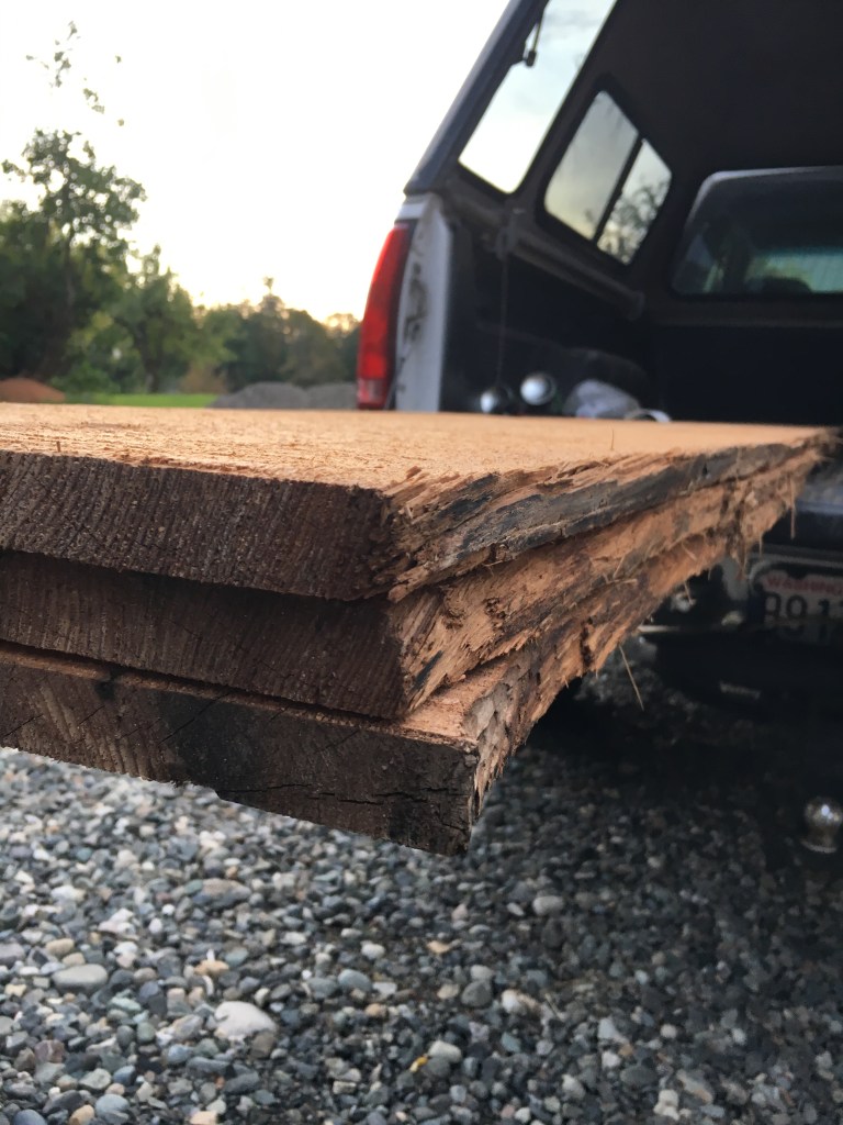 My FIL started the project off by chainsawing the logs we’d removed from the East wall that were in decent shape into 1″ x 12″ planks. We needed to replace all of the vertical board and batten on the upper South side, and all of the batten on the upper North side; so milling on those boards down took up a fair amount of time. He was kind enough to get started on them early and work on them through the week while we were working and schooling.