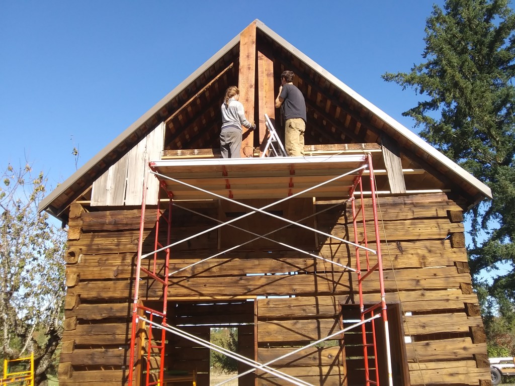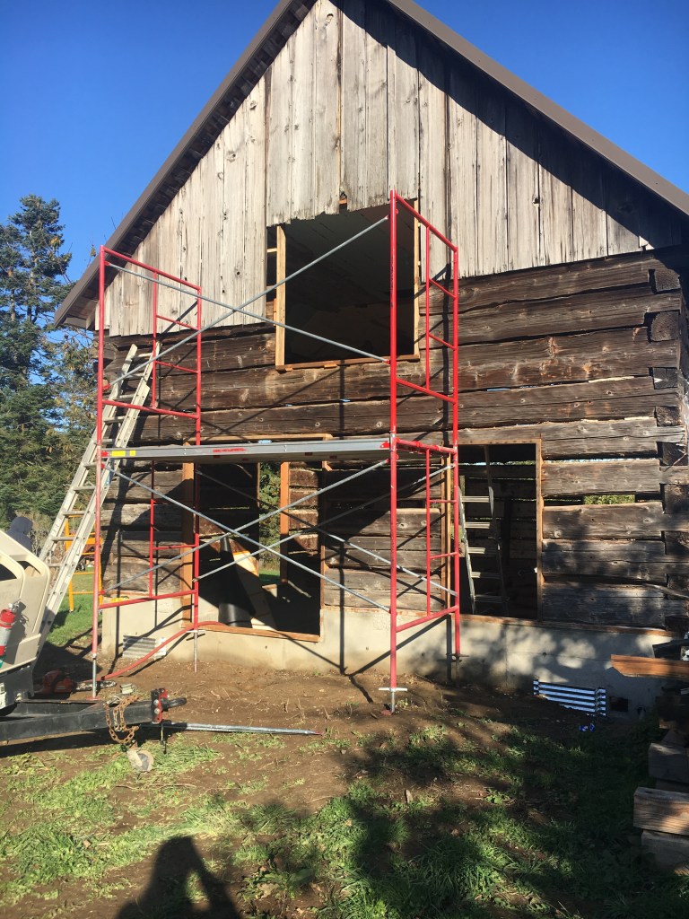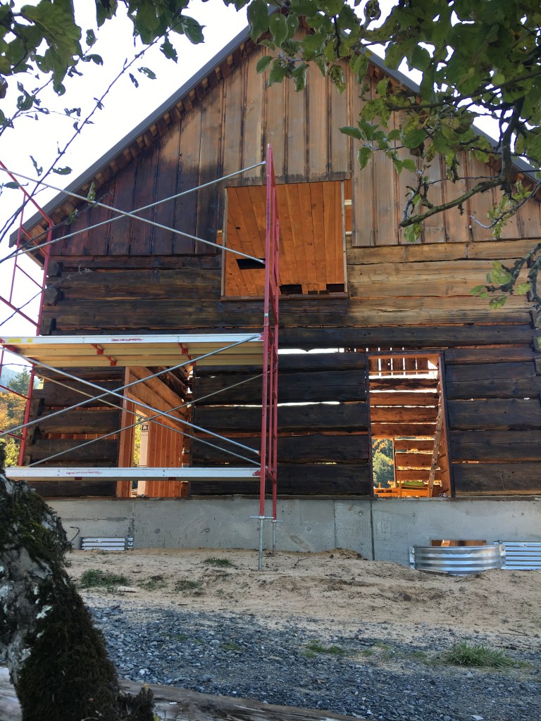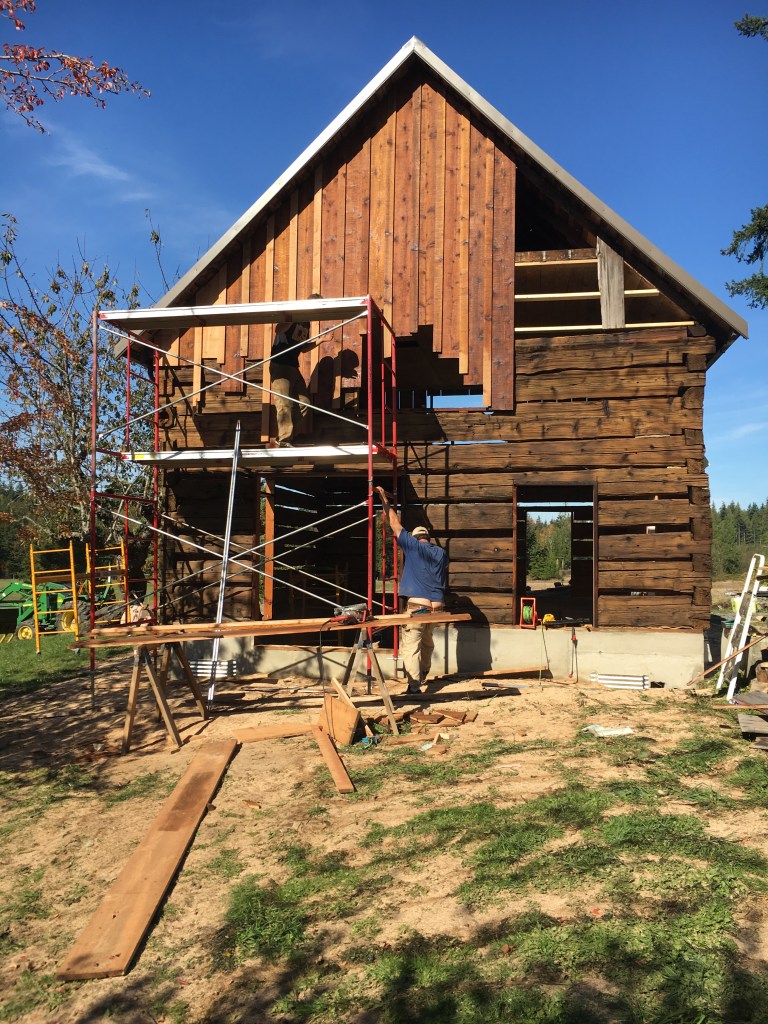 The next morning we started up on replacing the board and batten on the South side. Being at the top of the scaffolding is definitely not my favorite thing in the world. Husband would just walk around like normal while every step he took shook the whole thing. I’d be standing wide (and wobbly) legged with both arms out trying to hold onto whatever I could – Husband, the step latter (because we had to get higher), the Cabin. I was petrified the whole time! It was worth it though. The views were spectacular. They had me trying to figure out how we could add a little breakfast nook balcony off the kitchen vaulted ceiling window. I’m not sure how that’s going to work out yet haha.