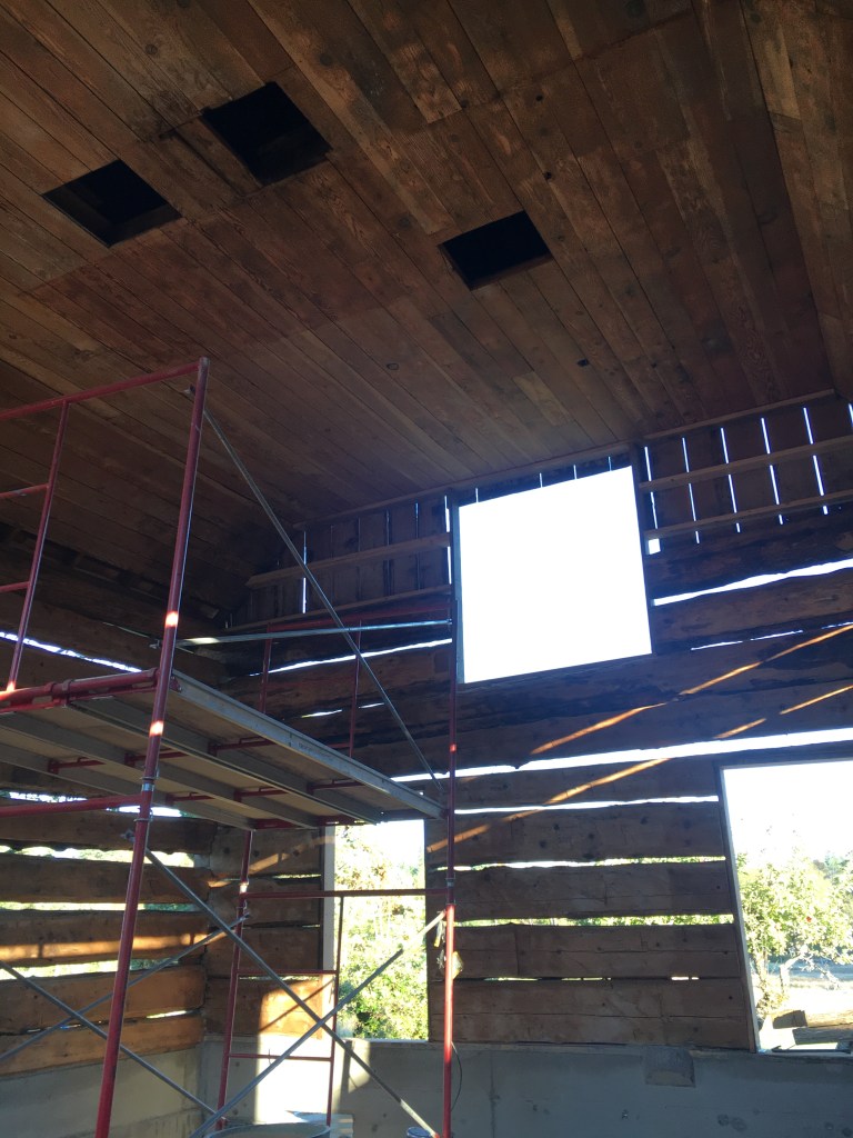 The North side had all bare batten. When we got done putting these up, it was the end of our long weekend, and the end of our good weather for a solid week. Fortunately, the next weekend we needed to start staining the interior, so we would be under cover throughout. Before we moved the scaffolding inside, we stained the peak of the North side batten as we were going to be returning the scaffolding that week. It was supposed to rain shortly, so we stapled up some plastic to keep the rain off for a couple days (though I didn’t get any pictures of that!). Then we began staining the interior and pulling nails as we went. There were a lot of nails. Everywhere.