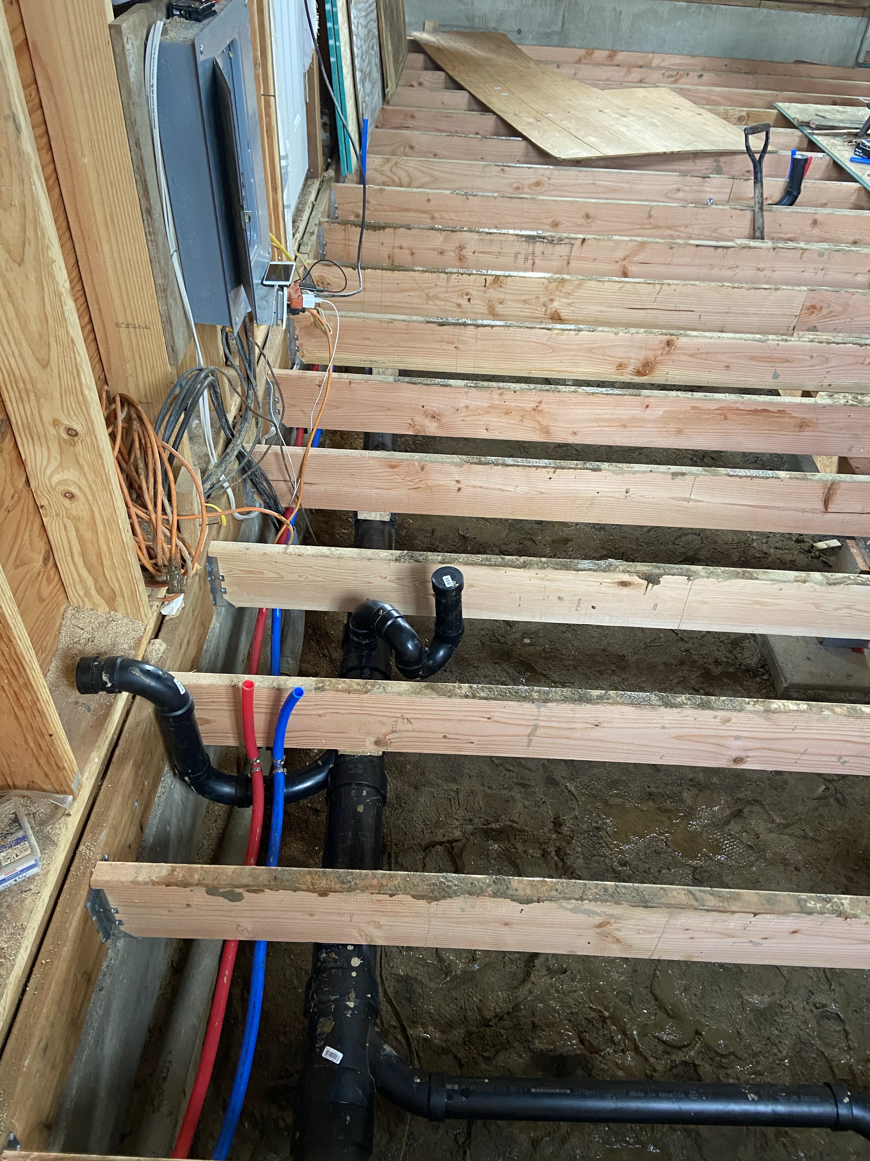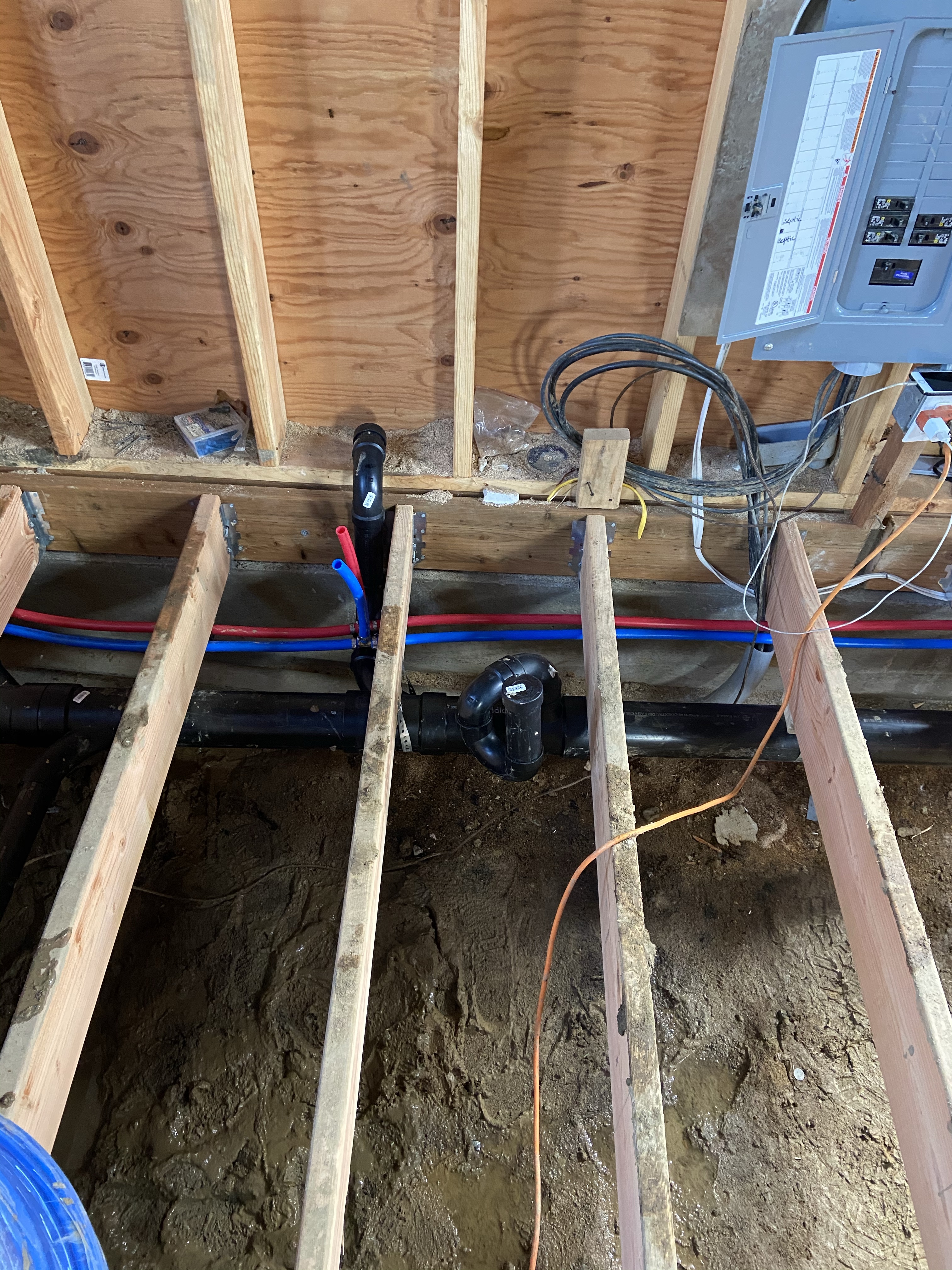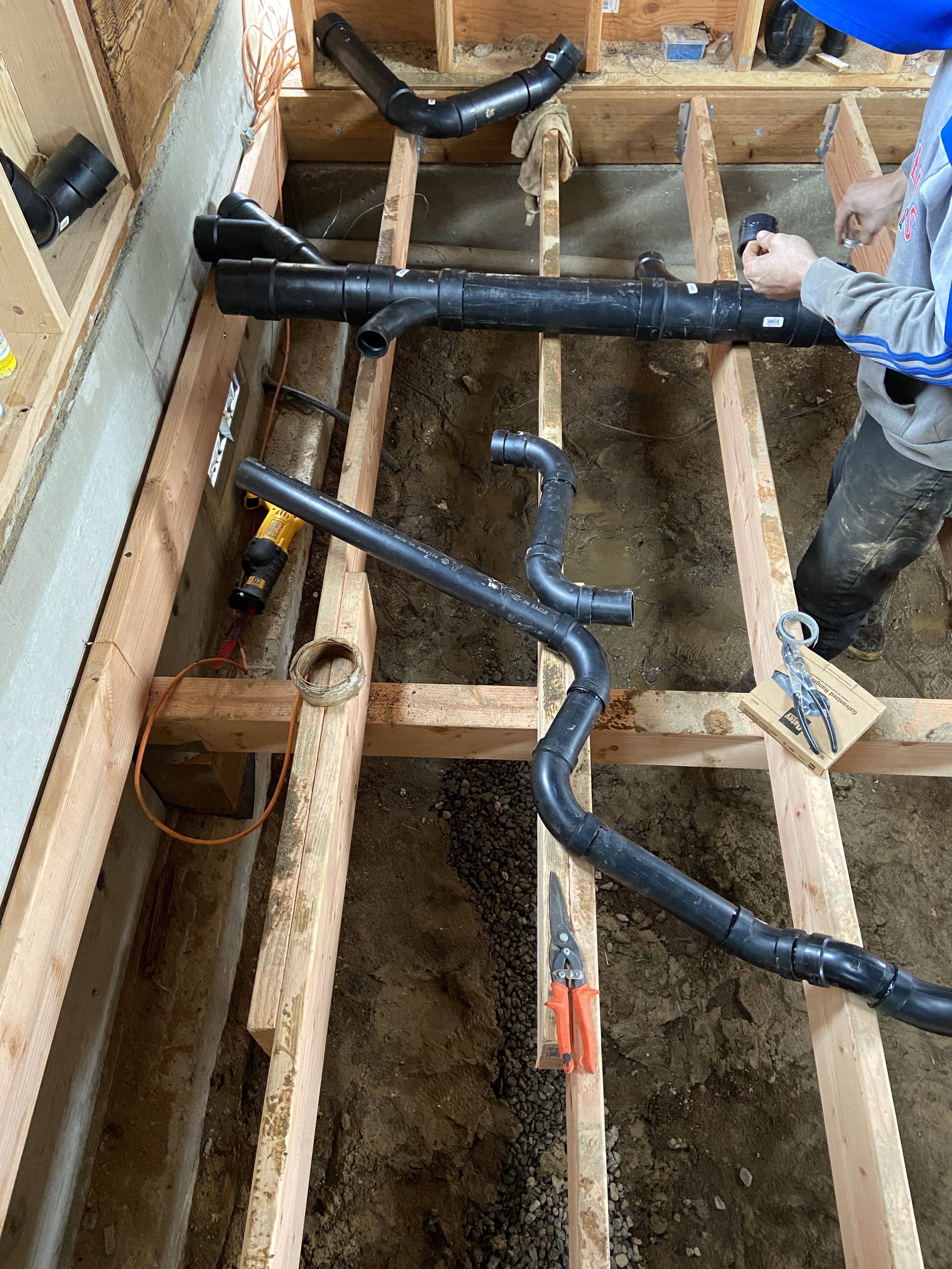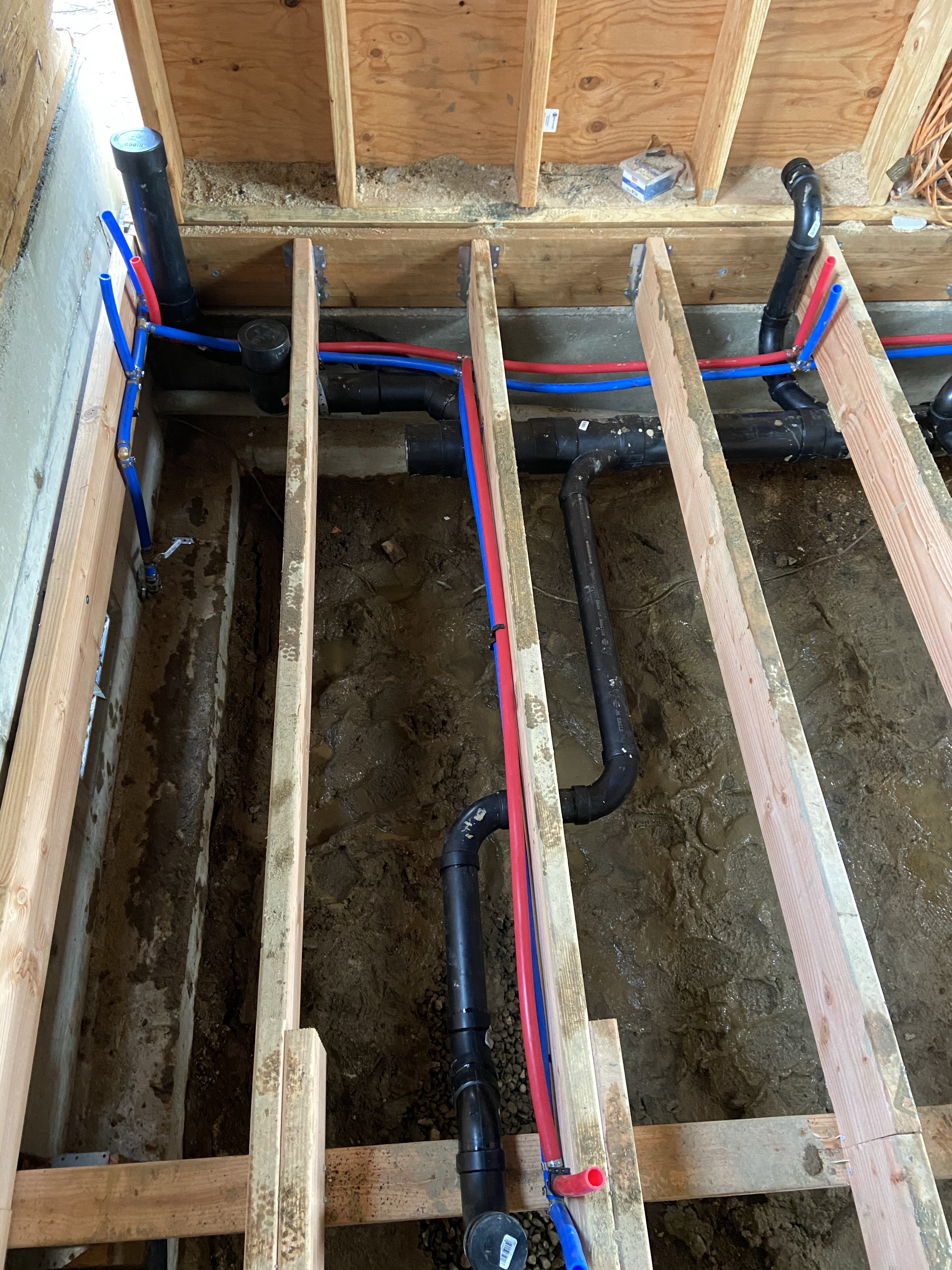 Eleven work weekends until the move in deadline! Last weekend we (mostly Husband and our buddy A) got ALL our sub-floor water lines in! We also finished the plumbing – got it all glued together and hung at the proper grade.