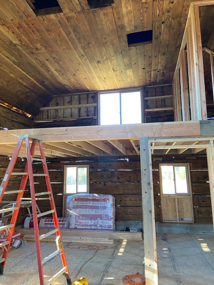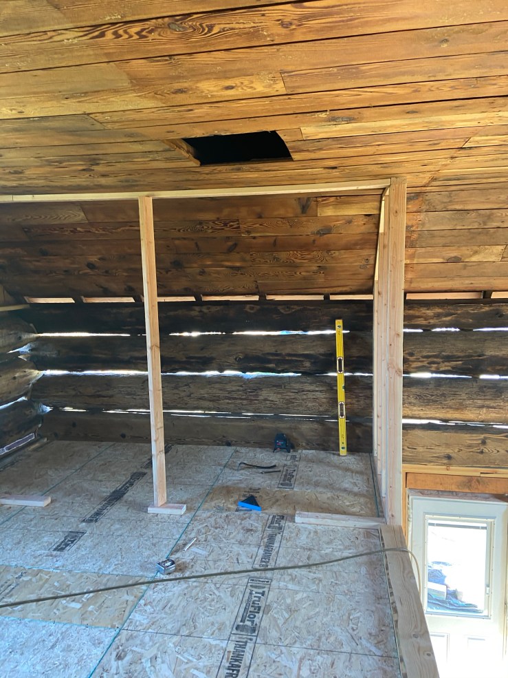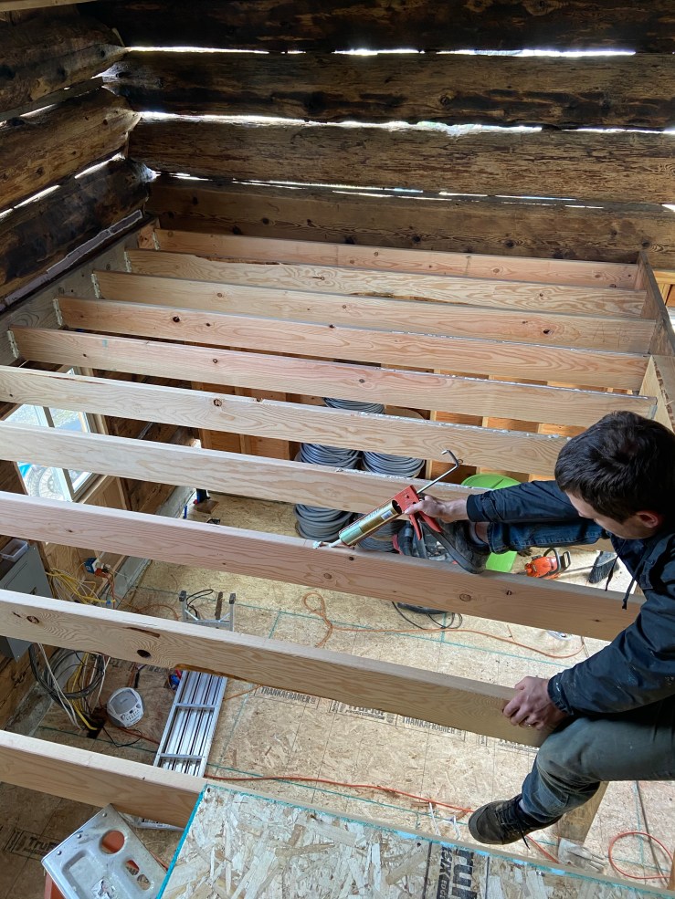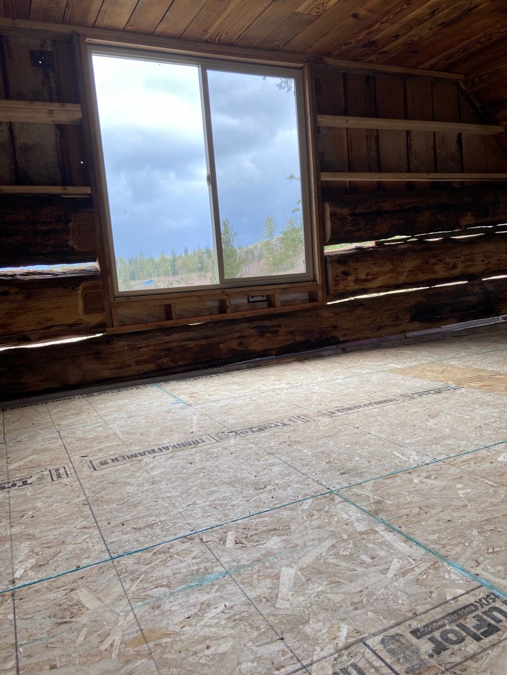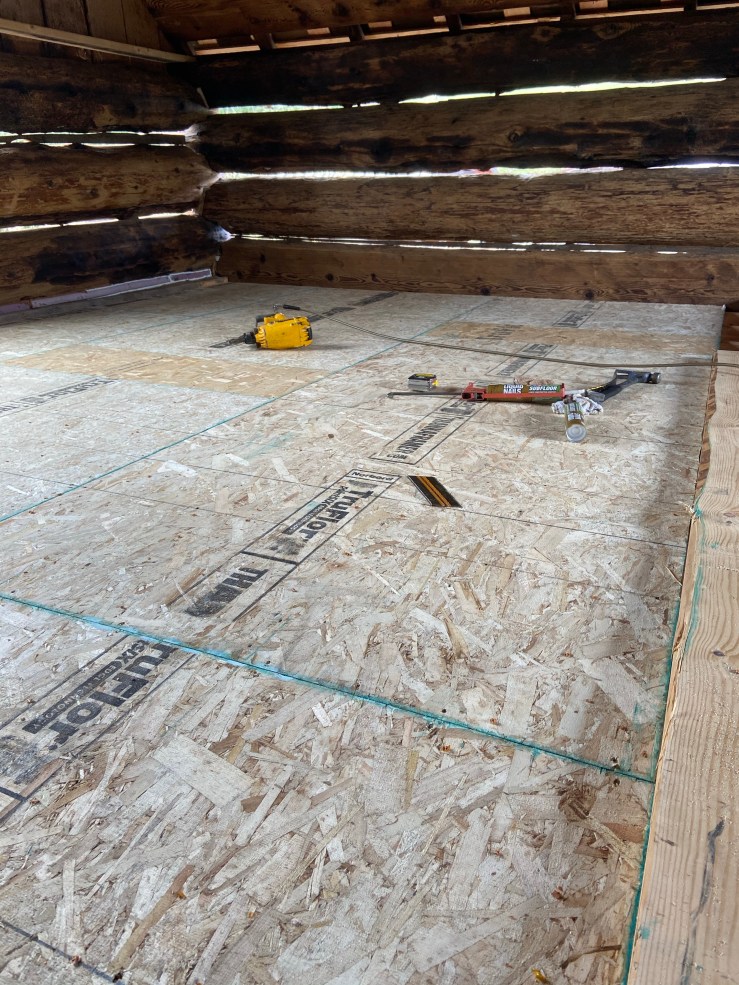We had to make sure the logs supporting the loft were all supported all the way down to the concrete and then seal in any gaps between logs before we could build the loft. Once that was done, we just had to put up a bunch of hangers and then hang the joists! After building the loft and putting in the floor joists, we were able to get a few boards of subfloor in all on the same day! Much thanks to the help of Husband and FIL. I definitely would not have been capable of most of the work. I did hammer in a TON of nails, my arm felt like jello by the end of the day. It was such an exciting and momentous accomplishment.