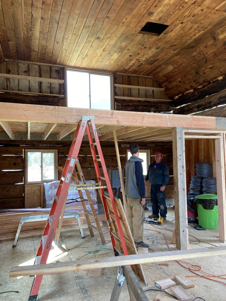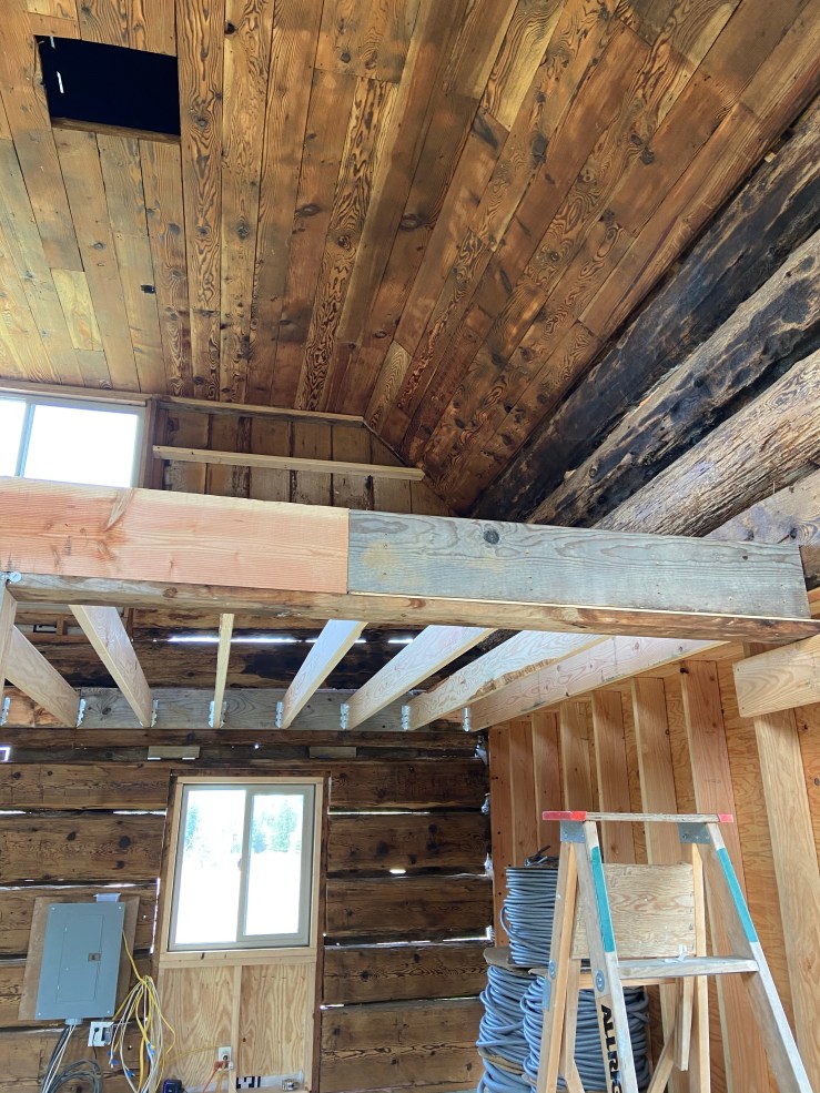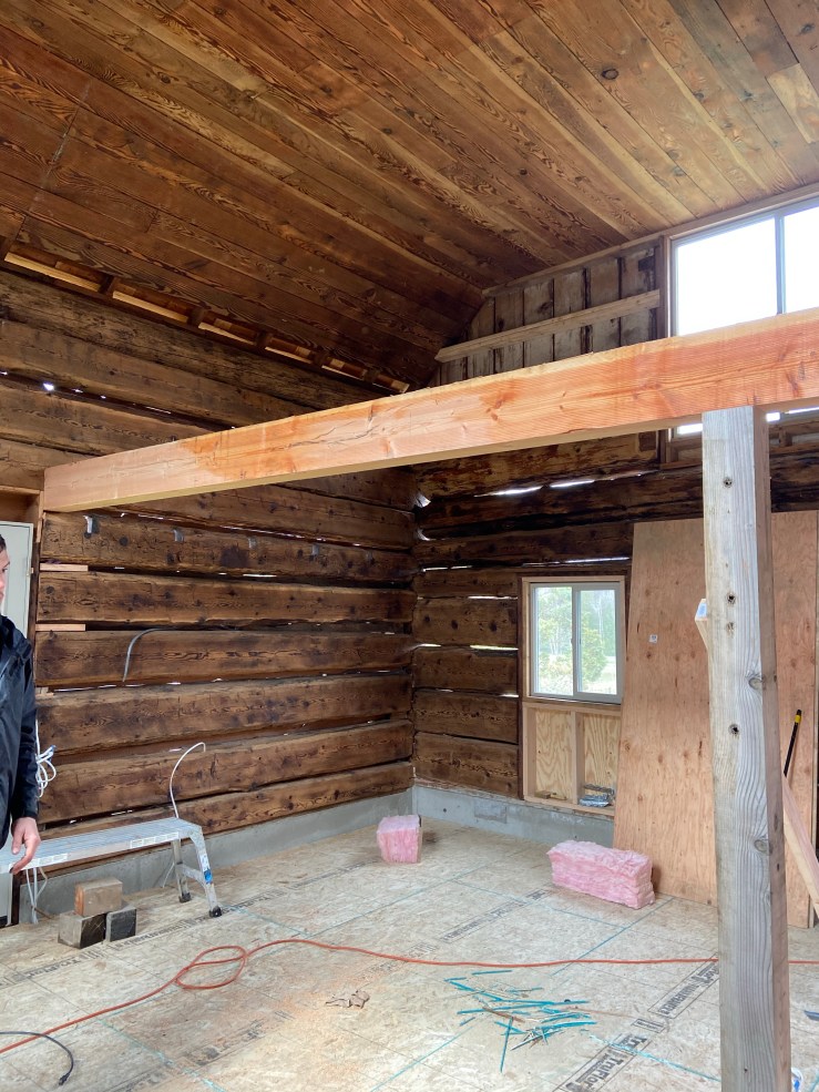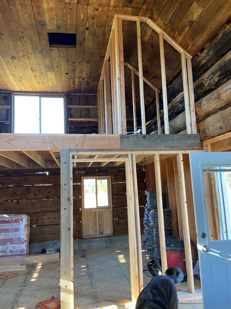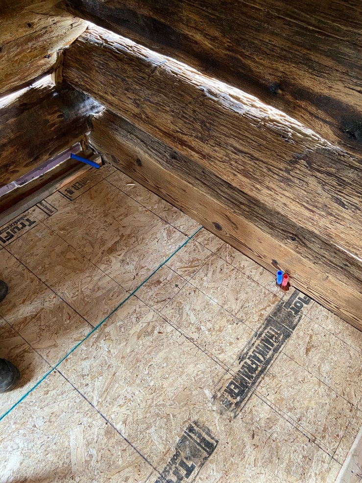 We had to make sure the logs supporting the loft were all supported all the way down to the concrete and then seal in any gaps between logs before we could build the loft. Once that was done, we just had to put up a bunch of hangers and then hang the joists! After building the loft and putting in the floor joists, we were able to get a few boards of subfloor in all on the same day! Much thanks to the help of Husband and FIL. I definitely would not have been capable of most of the work. I did hammer in a TON of nails, my arm felt like jello by the end of the day. It was such an exciting and momentous accomplishment.