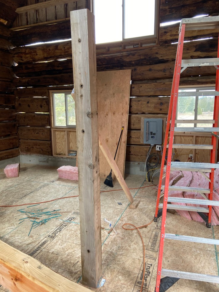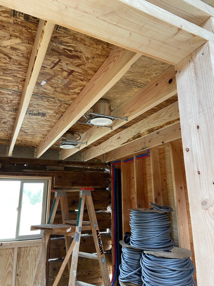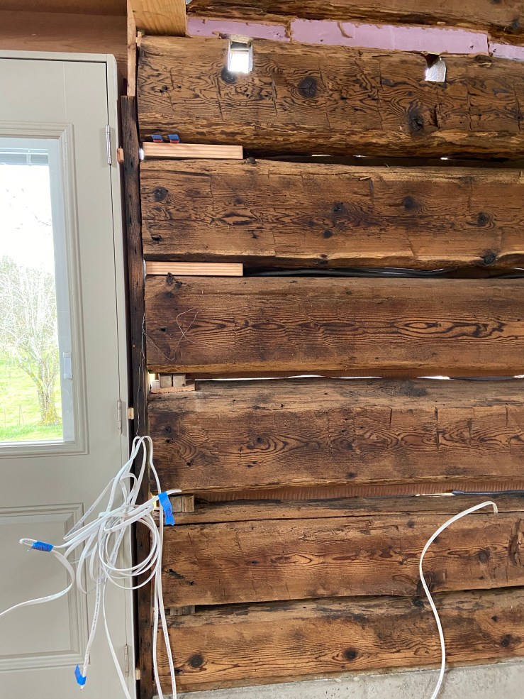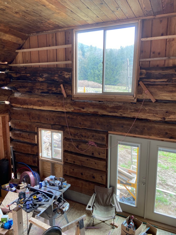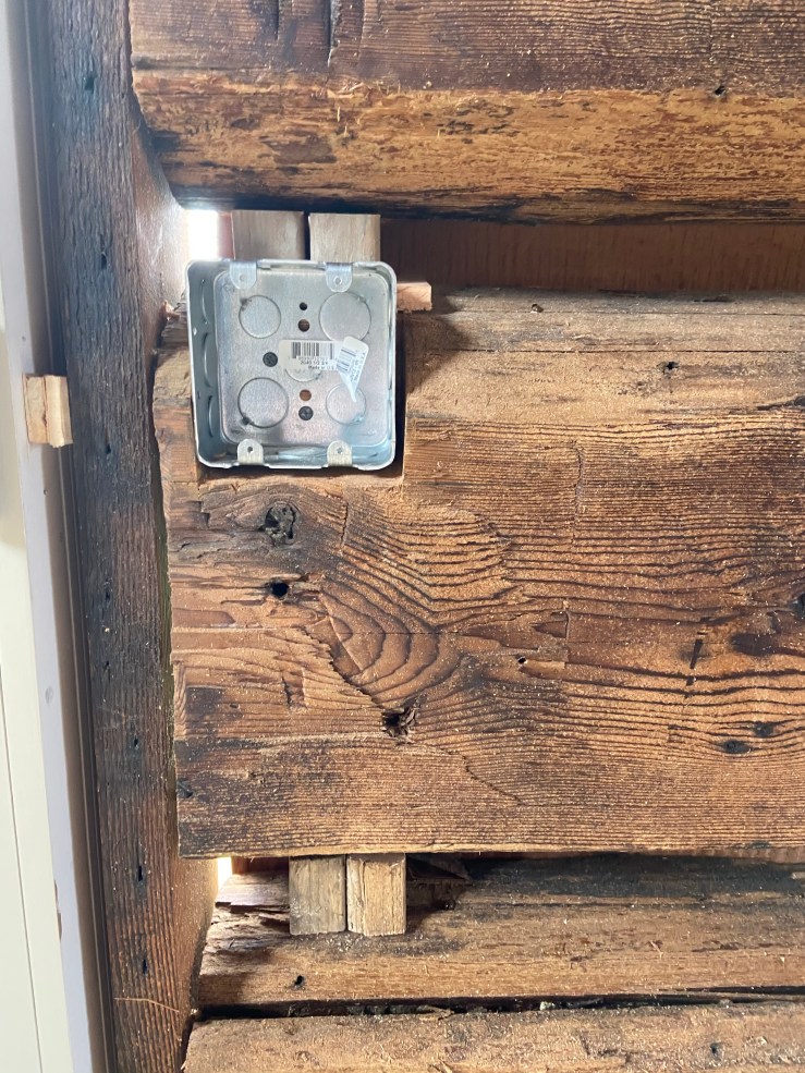 So then, I was all confident with my wiring skills, I installed and wired in the downstairs bathroom lights and switch. Which worked perfectly. Of course. And as I was on a roll, we moved upstairs and Husband helped me wire in the closet light and switch, the bathroom light and switch, as well as a fan and switch, and an outlet. Then we put in floor outlets for bedside tables (so we wouldn’t have to put any in the logs upstairs).