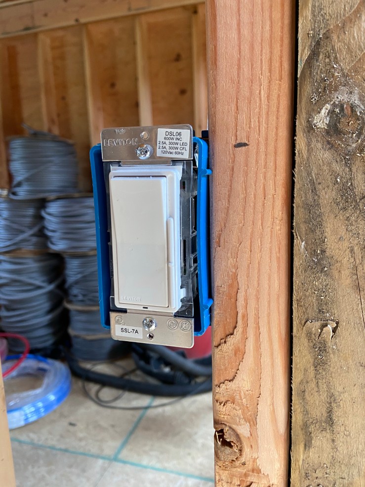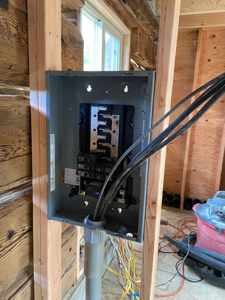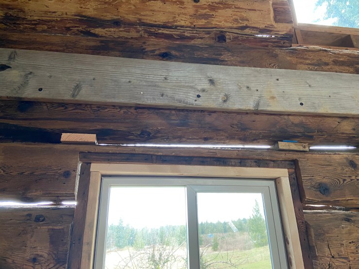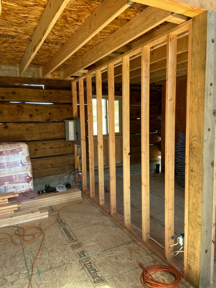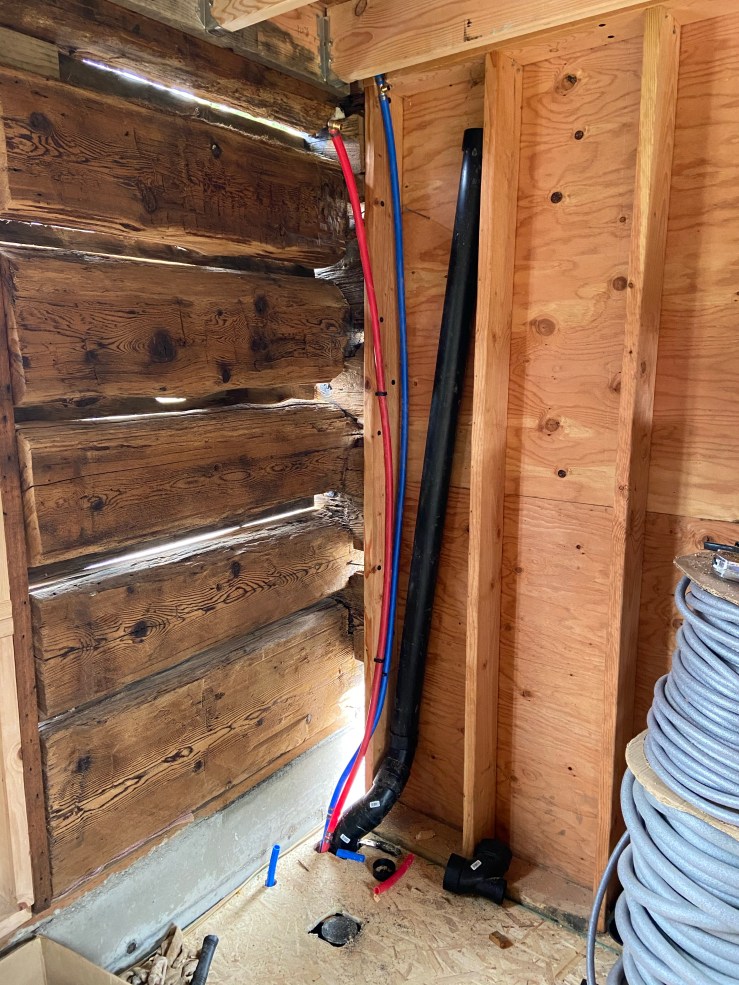 So then, I was all confident with my wiring skills, I installed and wired in the downstairs bathroom lights and switch. Which worked perfectly. Of course. And as I was on a roll, we moved upstairs and Husband helped me wire in the closet light and switch, the bathroom light and switch, as well as a fan and switch, and an outlet. Then we put in floor outlets for bedside tables (so we wouldn’t have to put any in the logs upstairs).