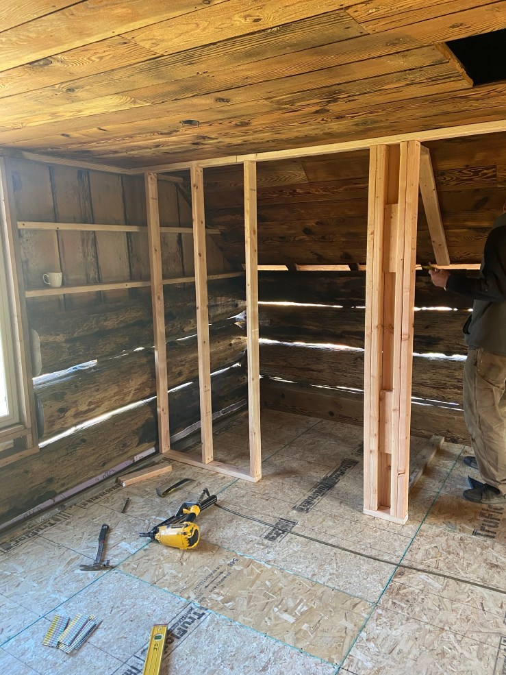 The following day we started off with finishing up the subfloor upstairs (though there aren’t actual stairs to the “upstairs” yet – much to Maverick’s frustration). And then we worked on building the downstairs bathroom walls. This was yet another project that made the Cabin really start to feel live-able. And another project we could do in just one day, with some spare time for Husband to work on his new mountain bike trail down our 3 acre parcel (his new hobby).
