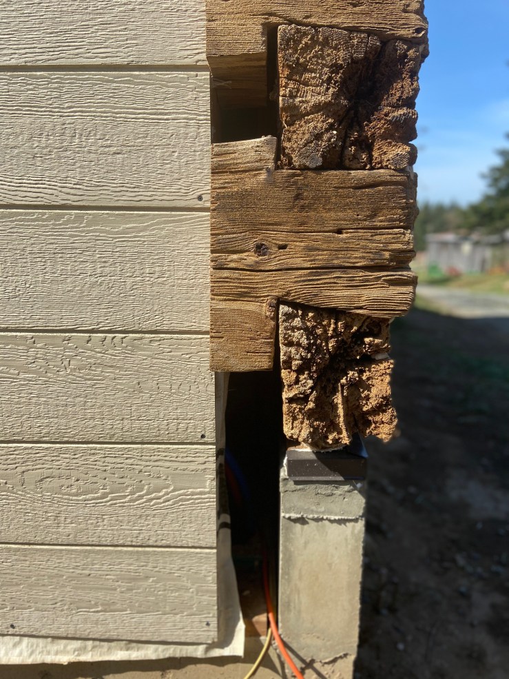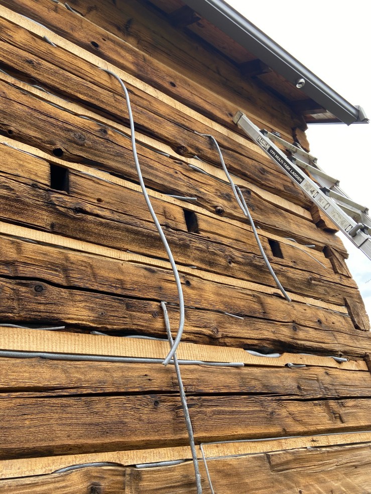We started on the West wall. And we had to start by fixing all the backer rod that had blown out and off (and all over the yard) through the Winter. In December (before New Zealand and all this Corona craziness) we were pushing really hard to get the Cabin sealed in before it got too wet; spoiler – it got too wet before we sealed the Cabin! So we’ve been in process of this project for over four months! And we finally got some prolonged warm dry weather this week!!