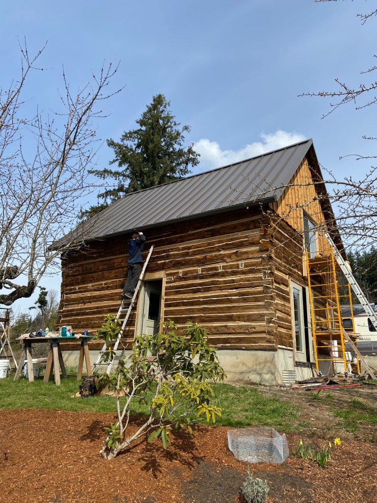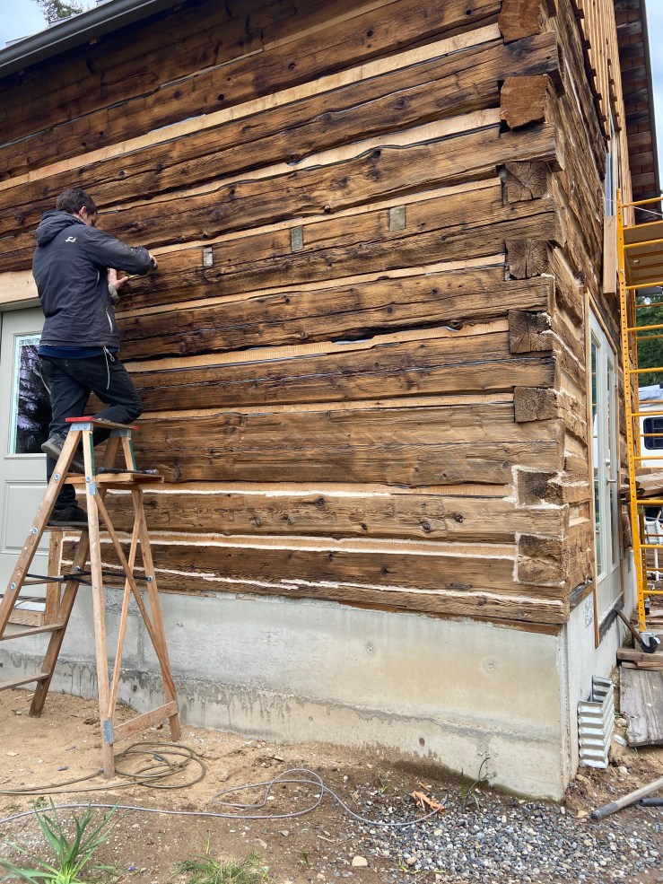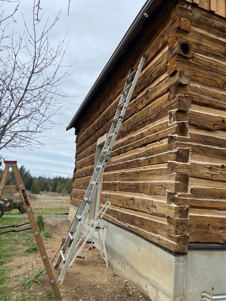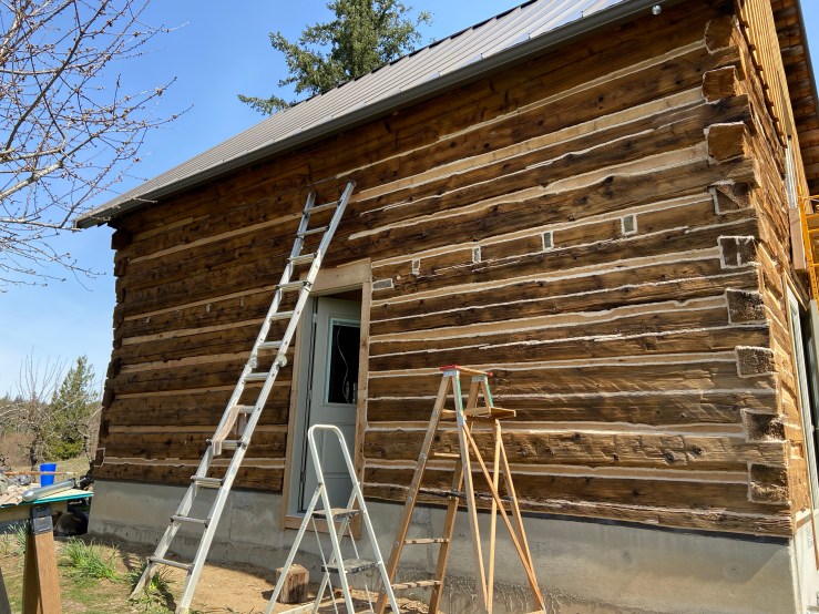 I did the chinking on the corners until the tall ladder needed to be utilized. Then I let Husband take over. Because he has some serious skill using ladders. (It’s terrifying). And I stayed on the ground and filled the chinking gun when it was empty and rinsed rags and cleaned up as we went – you know, the tough jobs.