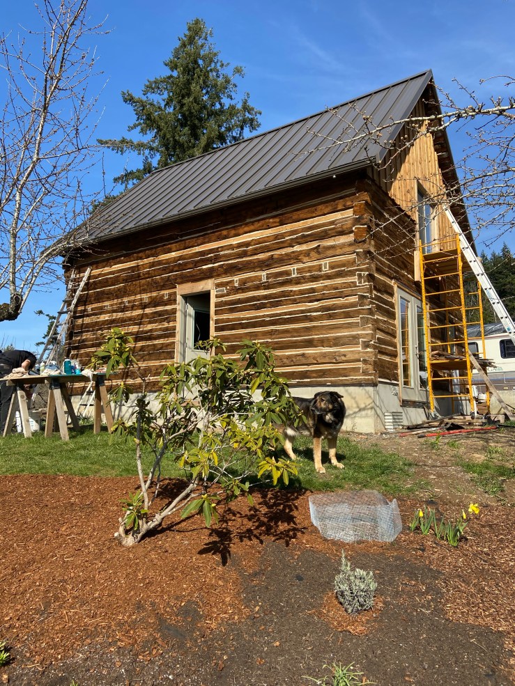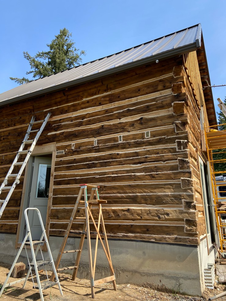 We’re still going to have to go around and fill a couple (many) little holes where the chinking pulled away from the wood as it dried (we totally didn’t make any mistakes, it just dried weird 😉 ). And we’re going to have to go and sand and stain some of the wood we’ve added to help fill holes. But even so, she’s gorgeous.