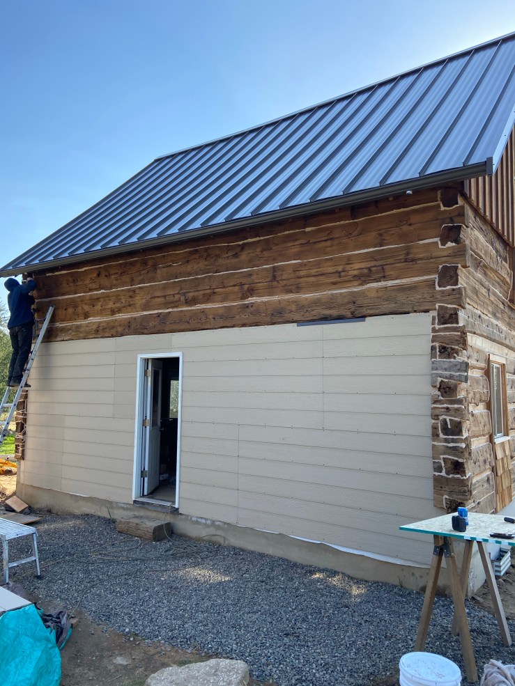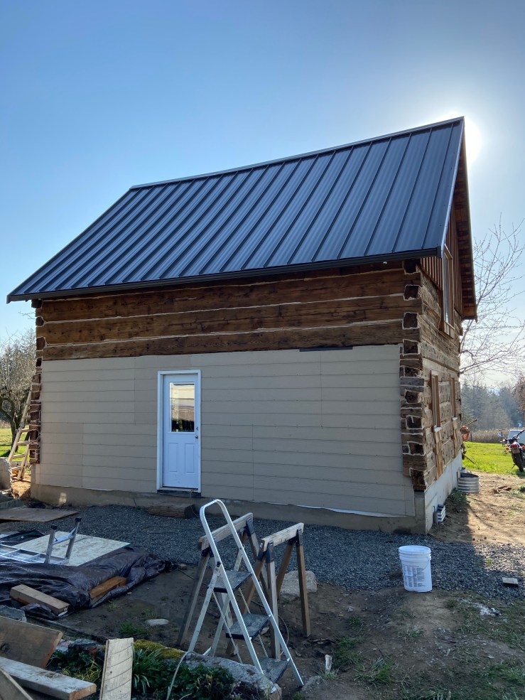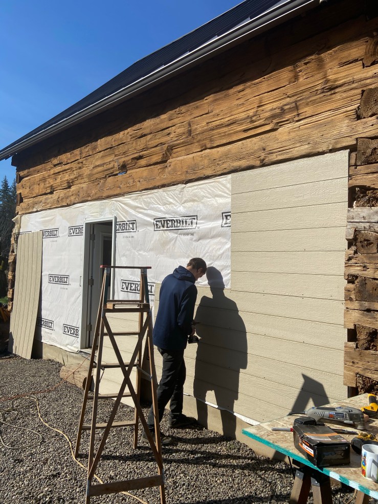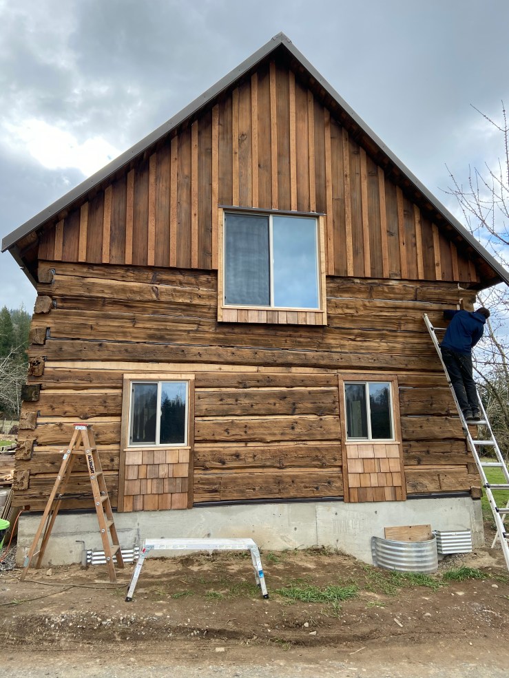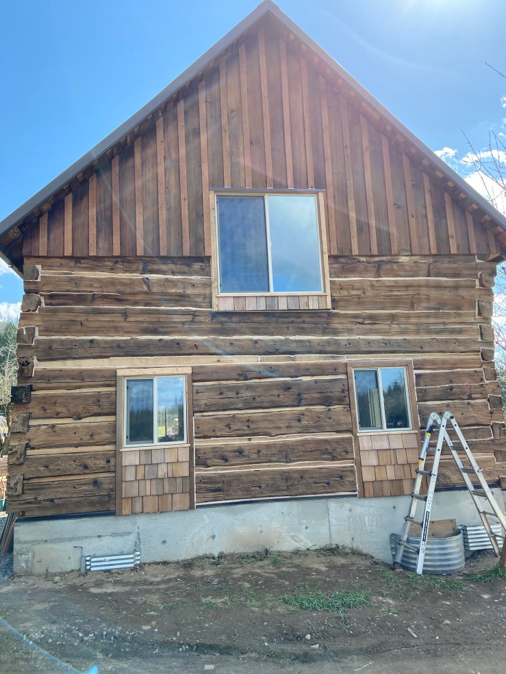 So then we started work on the replaced wall. Let me start off by saying I have loathed seeing that white paper every morning when we go to start work on the Cabin. It made the whole place feel like a crappy half pieced together pile of junk hardly worth our time and effort. Okay, I’m slightly exaggerating. But once that paper was covered, I realized just how much it was negatively affecting my view of the Cabin. It’s not done, still needs flashing and paint, but it is worlds better!