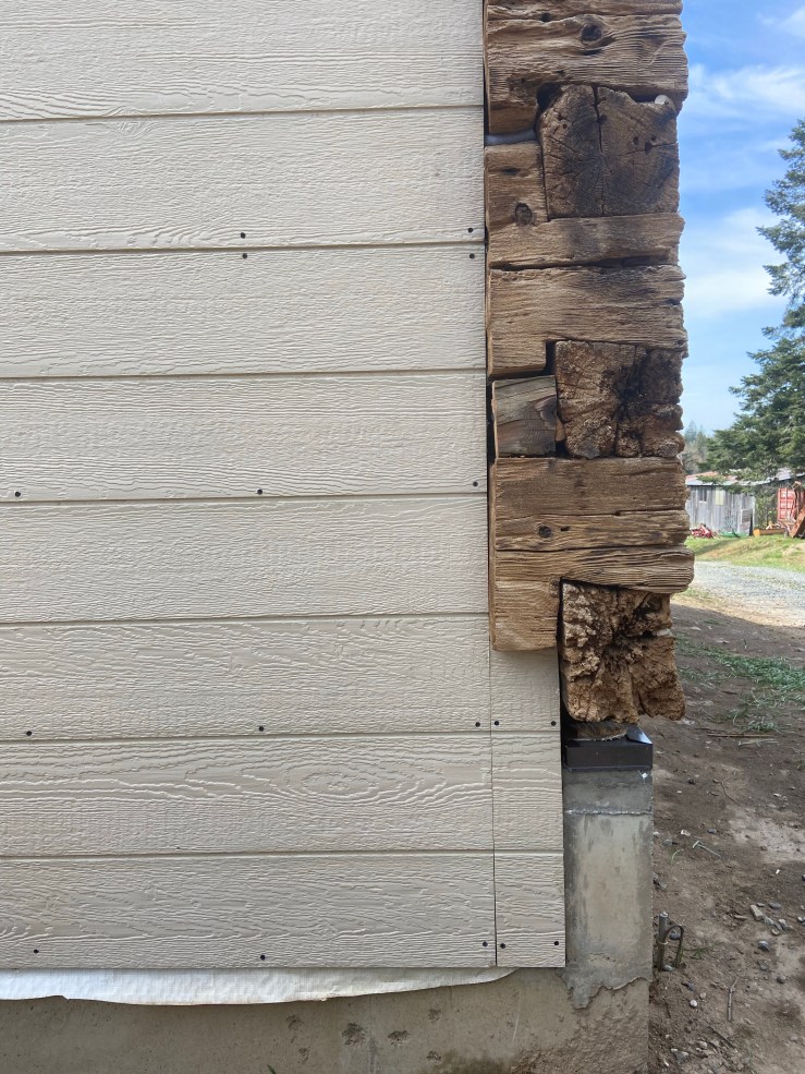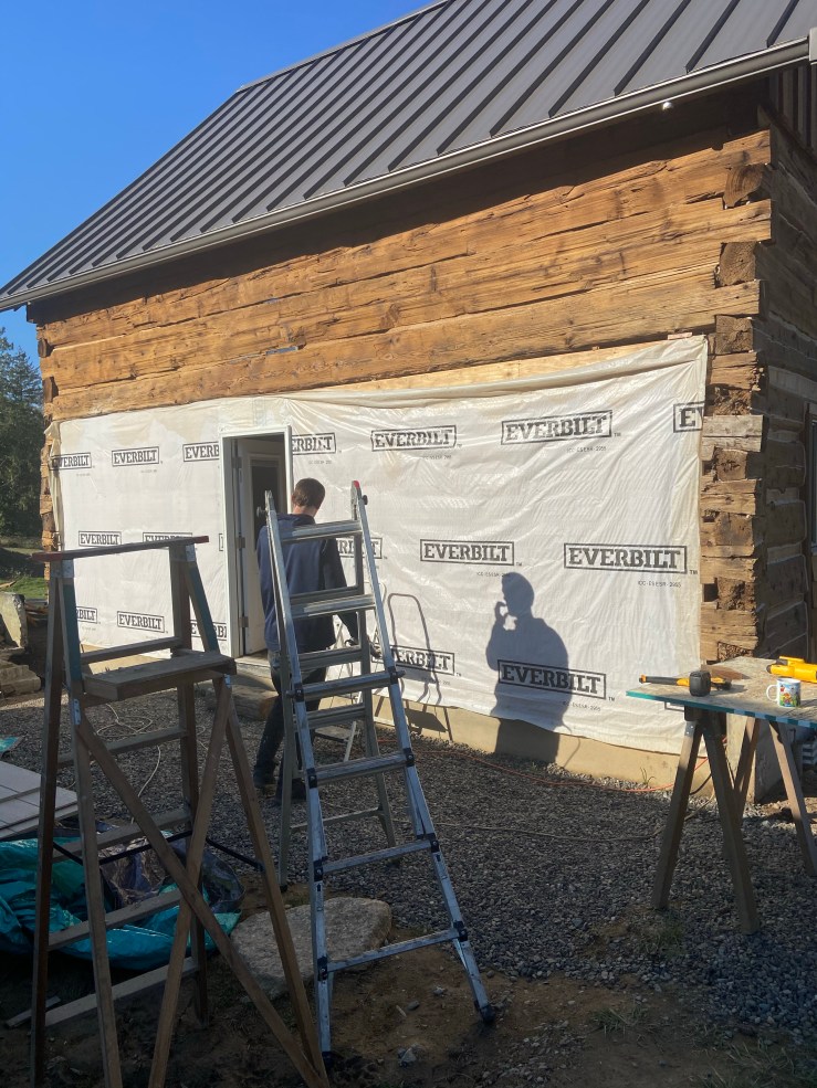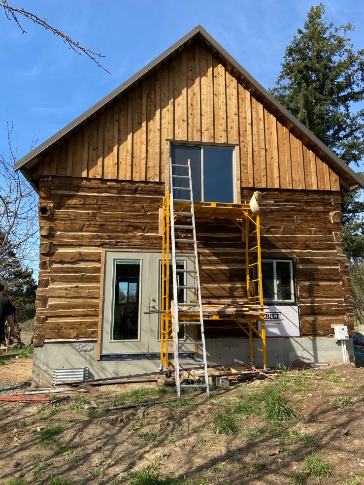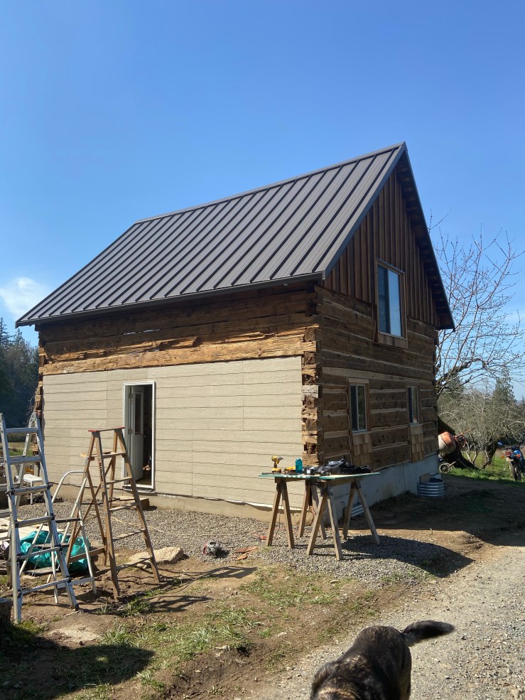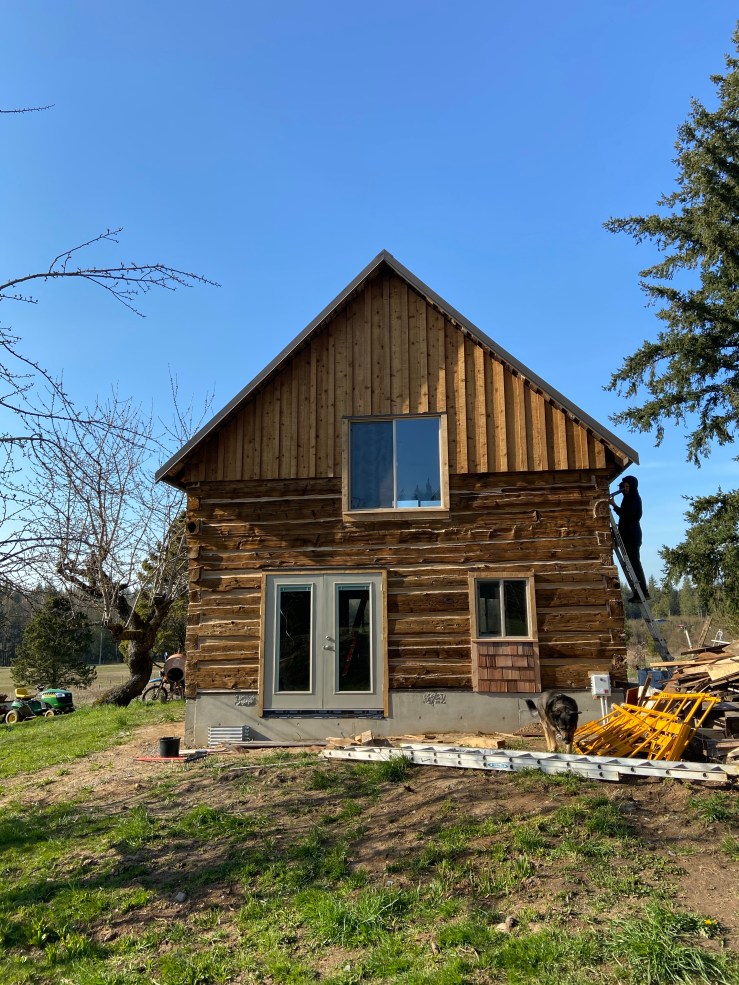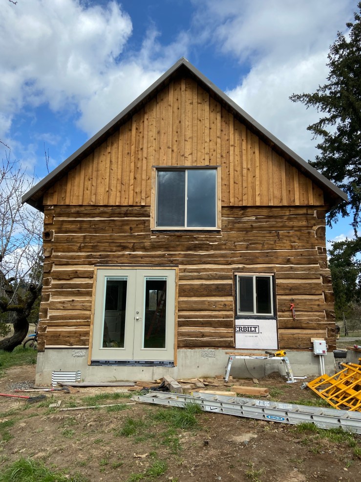 So then we started work on the replaced wall. Let me start off by saying I have loathed seeing that white paper every morning when we go to start work on the Cabin. It made the whole place feel like a crappy half pieced together pile of junk hardly worth our time and effort. Okay, I’m slightly exaggerating. But once that paper was covered, I realized just how much it was negatively affecting my view of the Cabin. It’s not done, still needs flashing and paint, but it is worlds better!