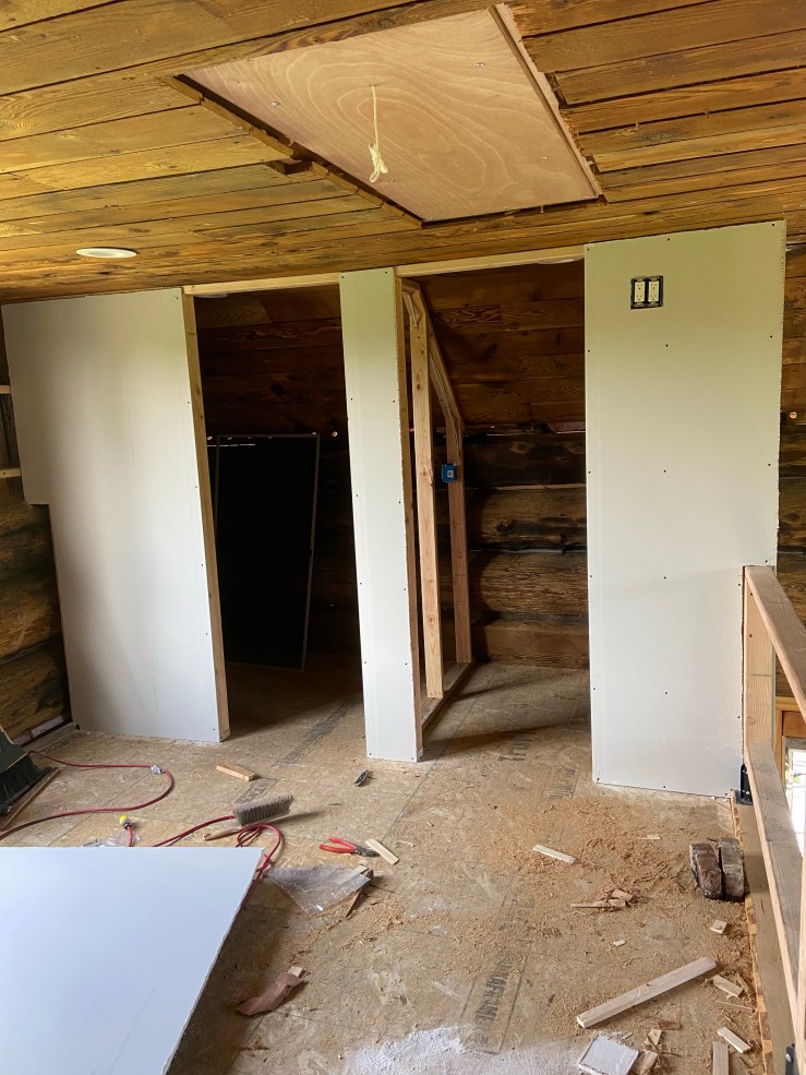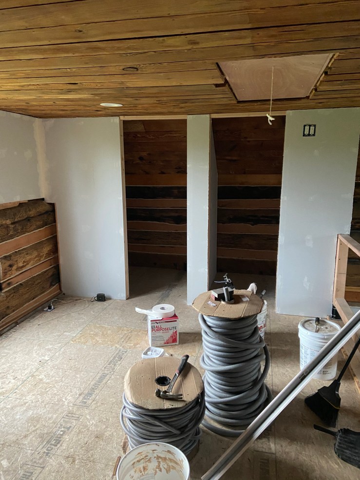 We clearly have loads more work ahead of us this week and weekend, but fortunately, we also have more time available to us! Husband has been able to leave work early last week and will be doing so again this week, and I am just working two days this week (instead of six!). We still need to do two more layers of mud on the drywall joints, paint, put down flooring, trim the walls, board and trim the ceiling, trim the floor, and then install the bathroom fixtures. Which, if I’m doing my math right, is about 8 full days worth of work. Wish us luck! But if we don’t make it into the Cabin until a week or two late, just don’t judge us on our inability to fulfill the proposed deadline π