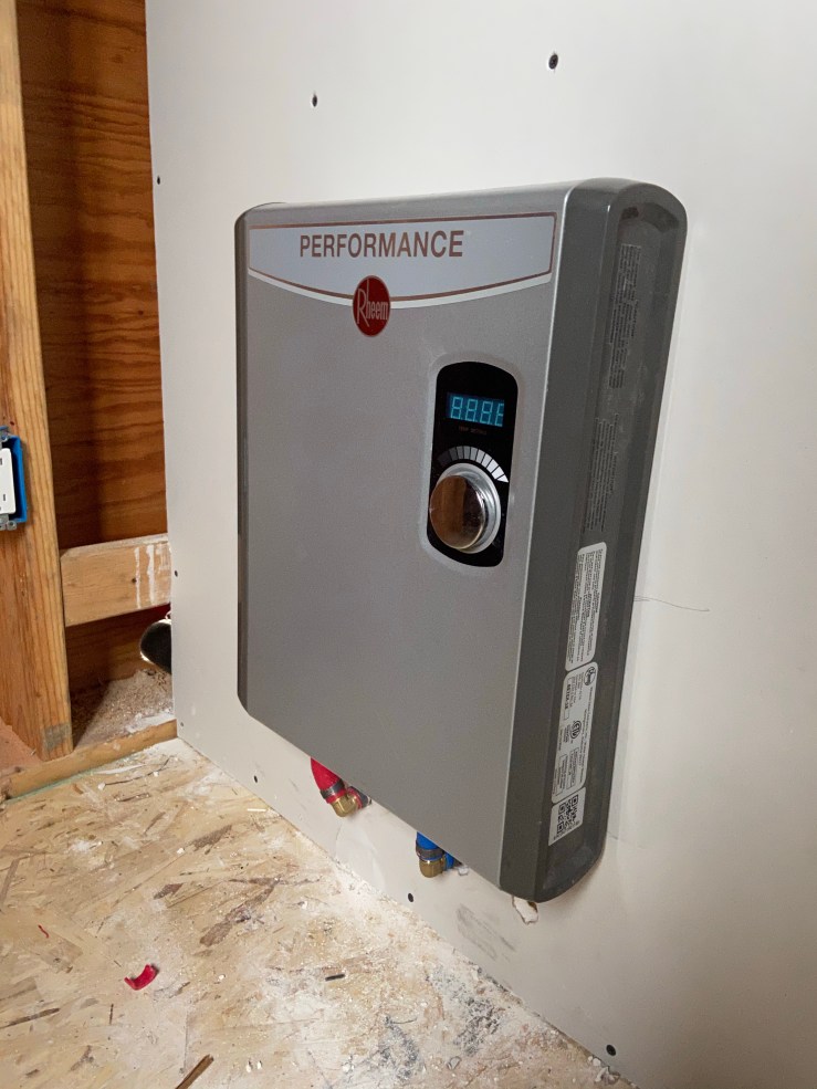 We had a lot of little things that we had to tie up before we could actually insulate and drywall. So the project itself took a lot longer than anticipated because we kept running into loose ends that needed finishing. Oops! It was bound to happen at some point though :). One of those loose ends led to us getting our hot water heater in and wired. We opted to keep it out of the wall and will be putting a cabinet around it so that we can still remove the cover and work on it if any issues arise.