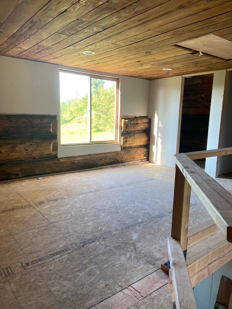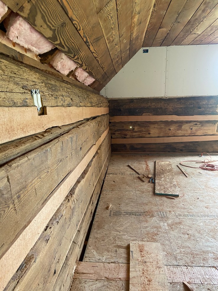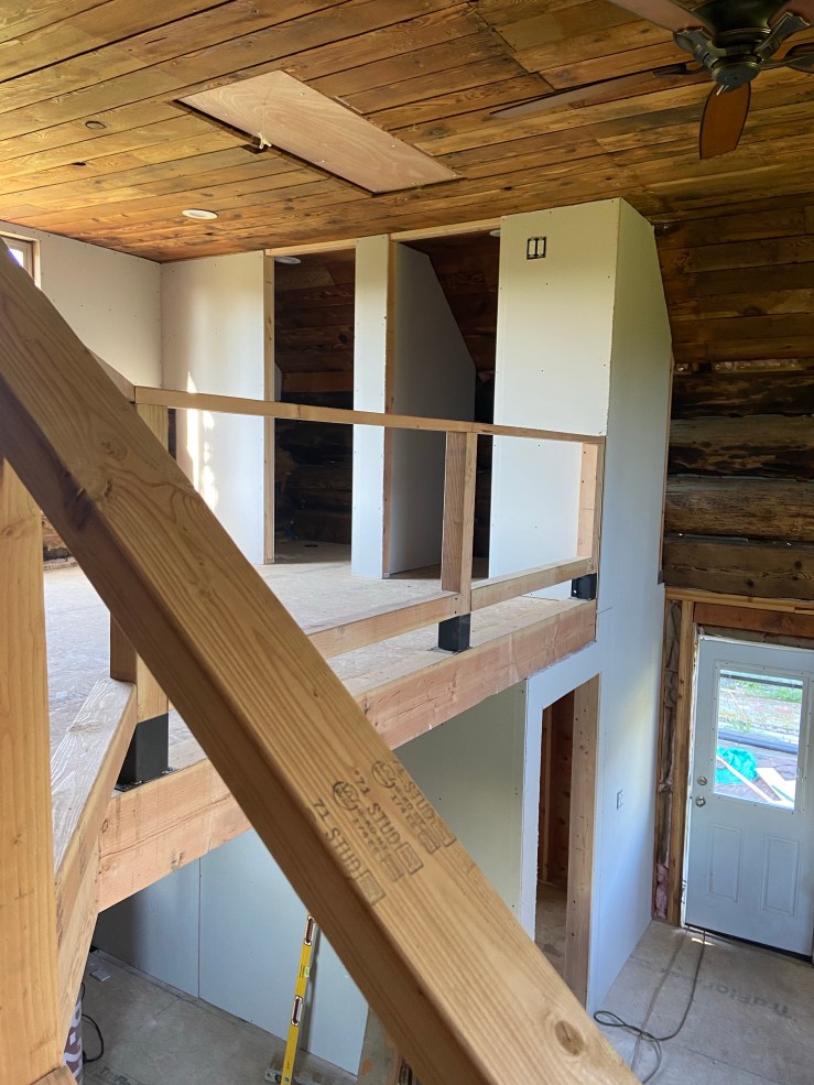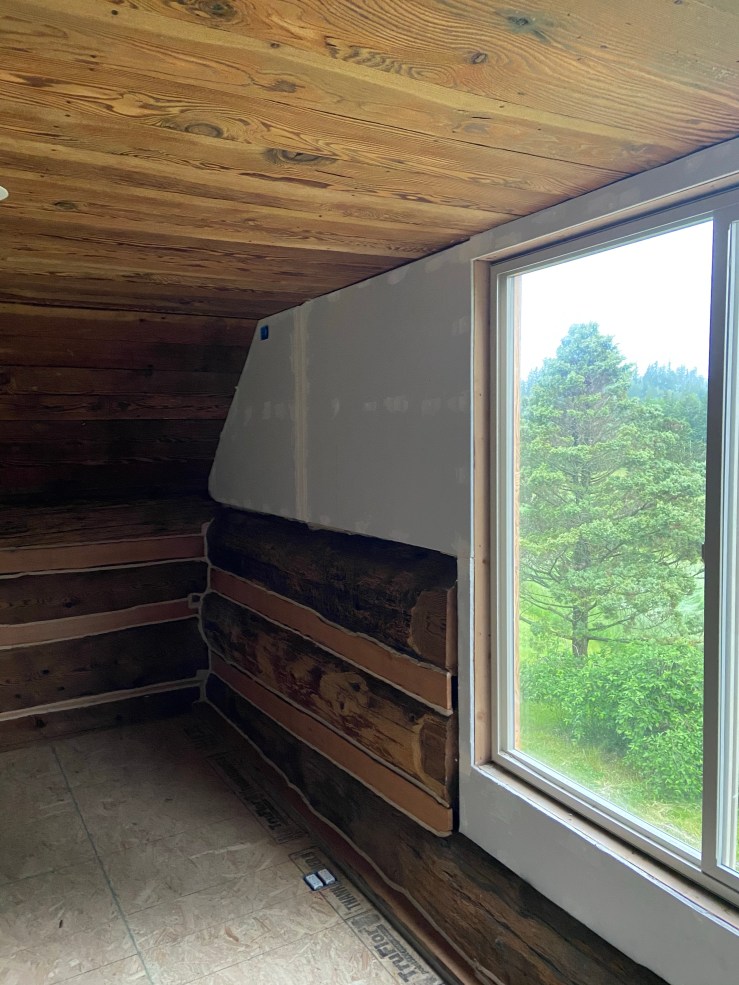 We got the whole loft insulated and drywalled! It took a bit of tedious work, and we will still have to put trim around where the drywall meets the logs, but it is really starting to look like a livable space now! This weekend we finally got to the chinking on the interior logs of the loft, and we were able to get the first layer of mud and tape on the drywall in the loft!