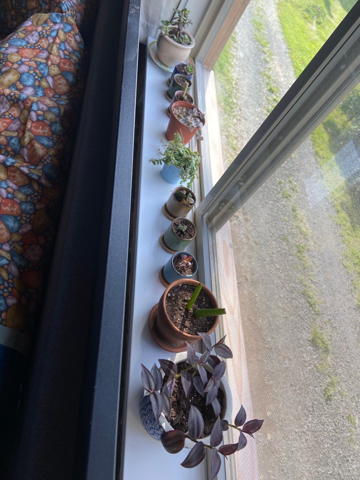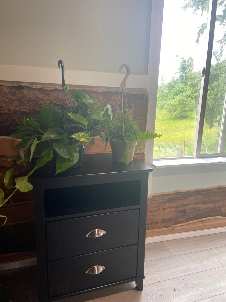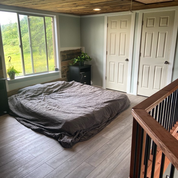 We did finally get the toilet in the bathroom and the vanity in! But for some reason I don’t have any pictures of those, and I’m not home to take some. So I suppose that’ll be a later update! While E was working on our railing, our good friend A helped build our bedside tables. By the time we finished the projects that Friday evening, we were able to move our bed up! I had already purchased some new plants to live in our new loft, so I just set those up as well. It took us almost another week to get the bed frame, and then we installed the blinds and curtains! Everything arrived a little late, but moving in early was well worth sleeping on the floor mattress :)!