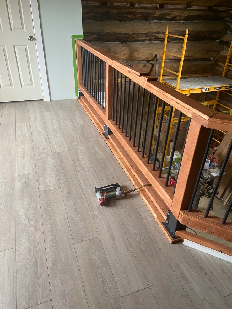 Once we got the trim all done, I went to work on the railing. We had already sanded and stained it, so I put some polyurethane on it. I’m not kidding, I despised the stain we picked..but when I put the polyurethane on it, somehow it just pulled everything together and it looked really really great! The last thing we had to do with the railing was get all the spindles installed and the top plate put on. Our friend E helped us out by getting all of the spindles in (THANK GOODNESS!!).