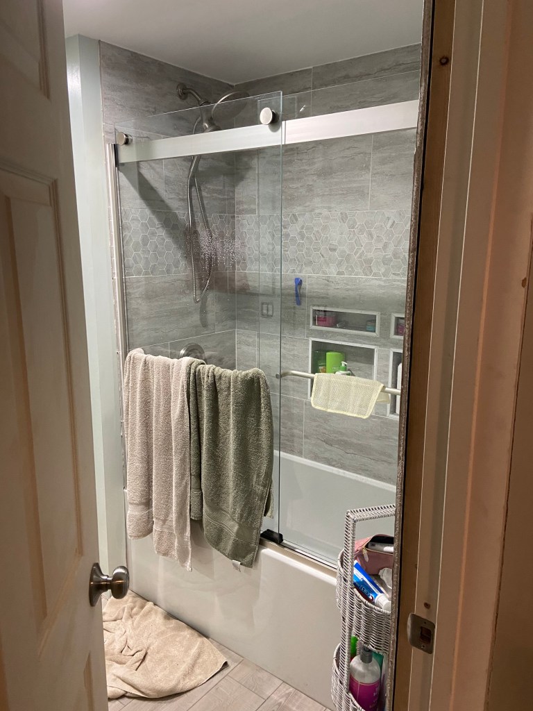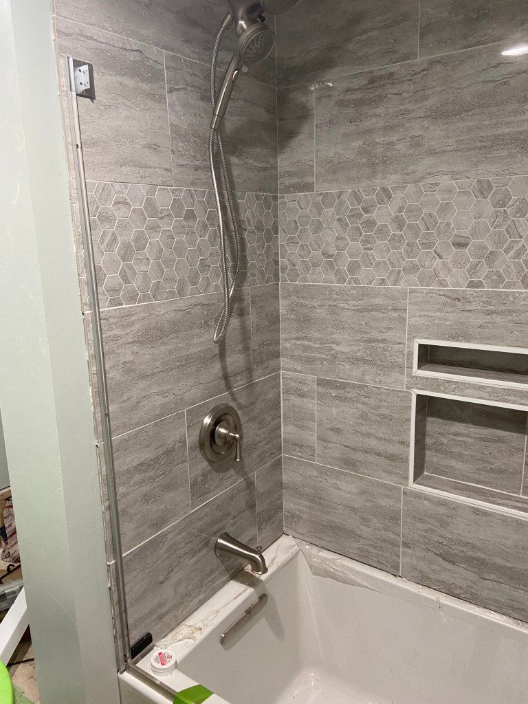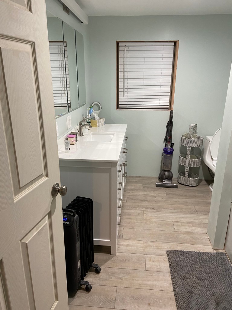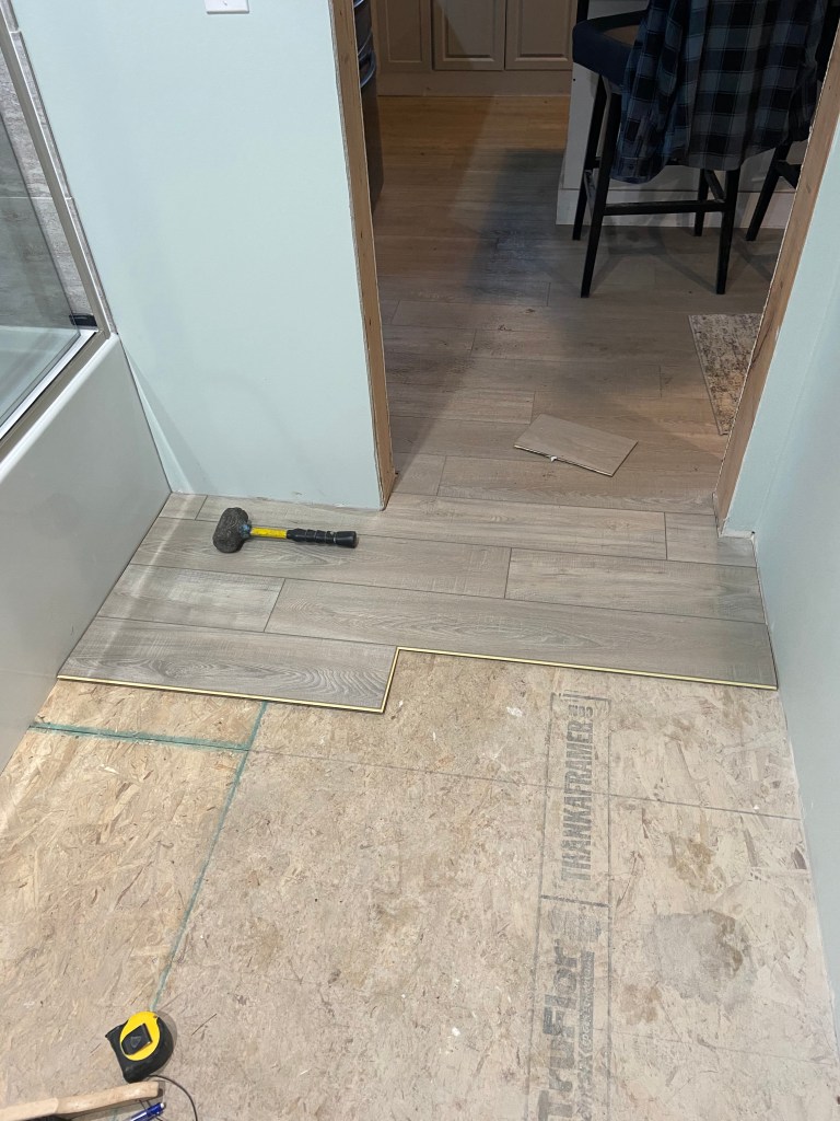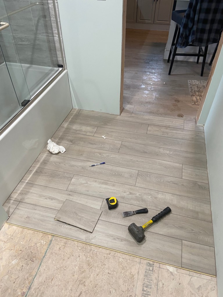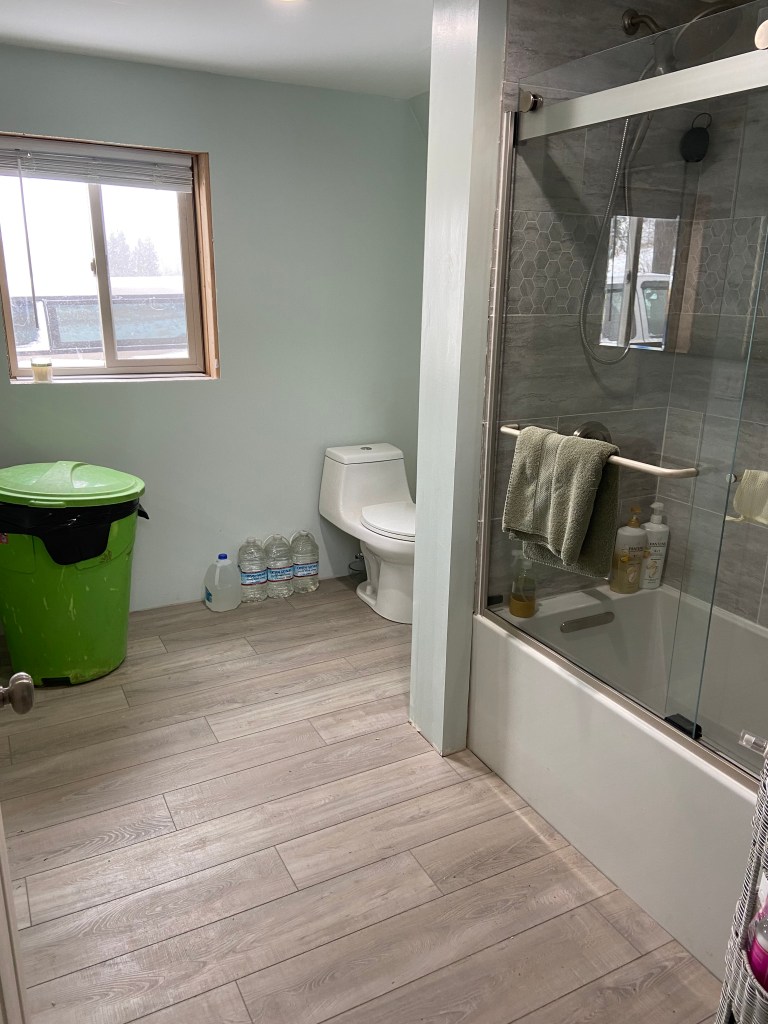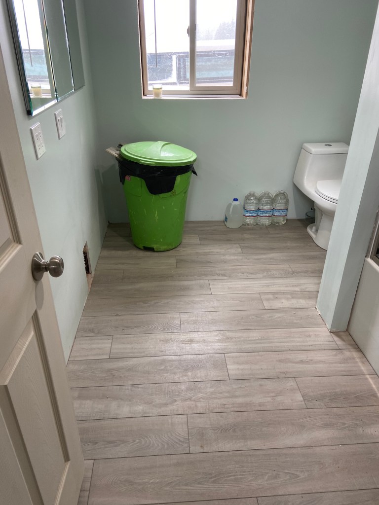 We installed flooring as soon as we finished the tub and shower installation and wow did it change the bathroom. It suddenly felt like construction in the home was finally wrapping up! Throughout this project I have been regularly excited about each process that is completed and each one we start. I think after we finished the *bare minimum* on the bathroom, I was no longer excited to start anything new. I’m hoping with a break I will get excited to start the projects we have left!