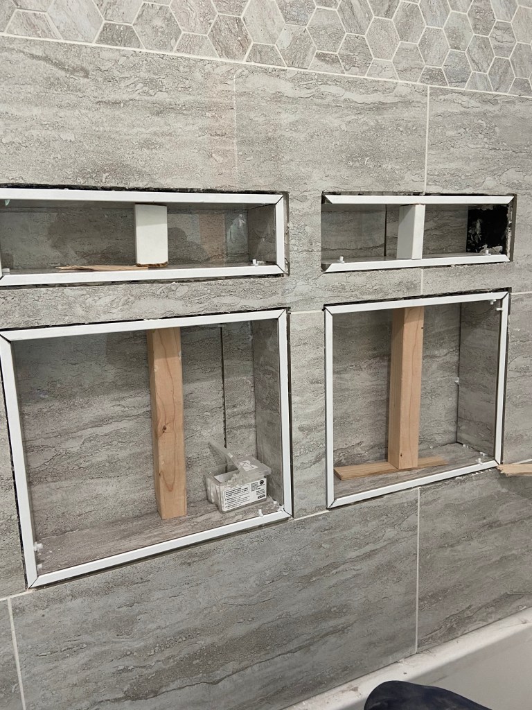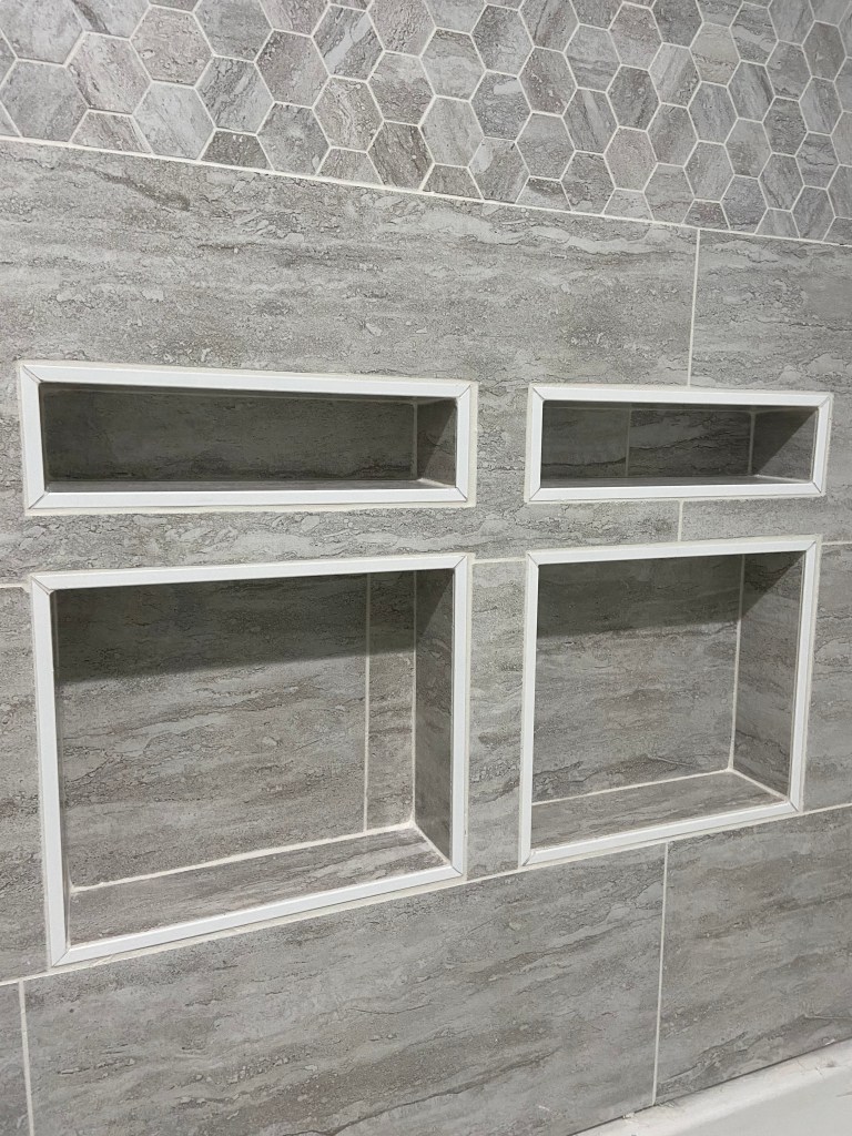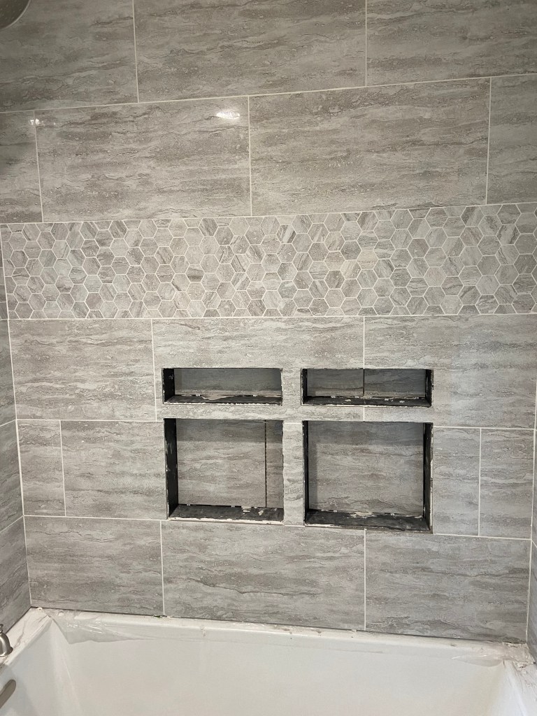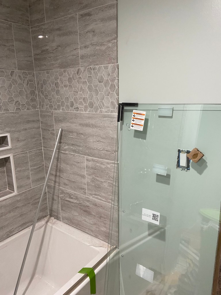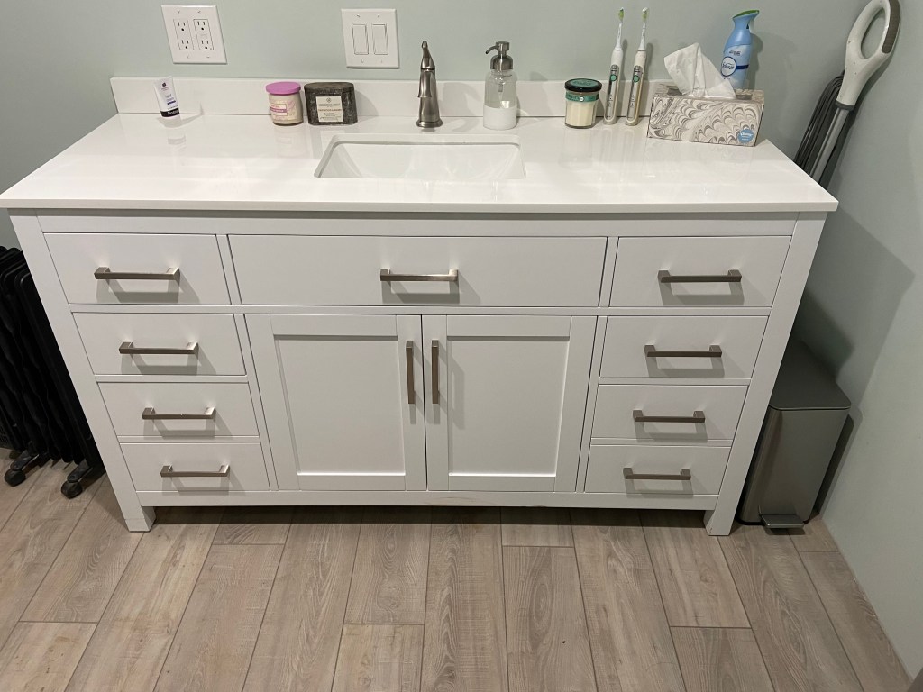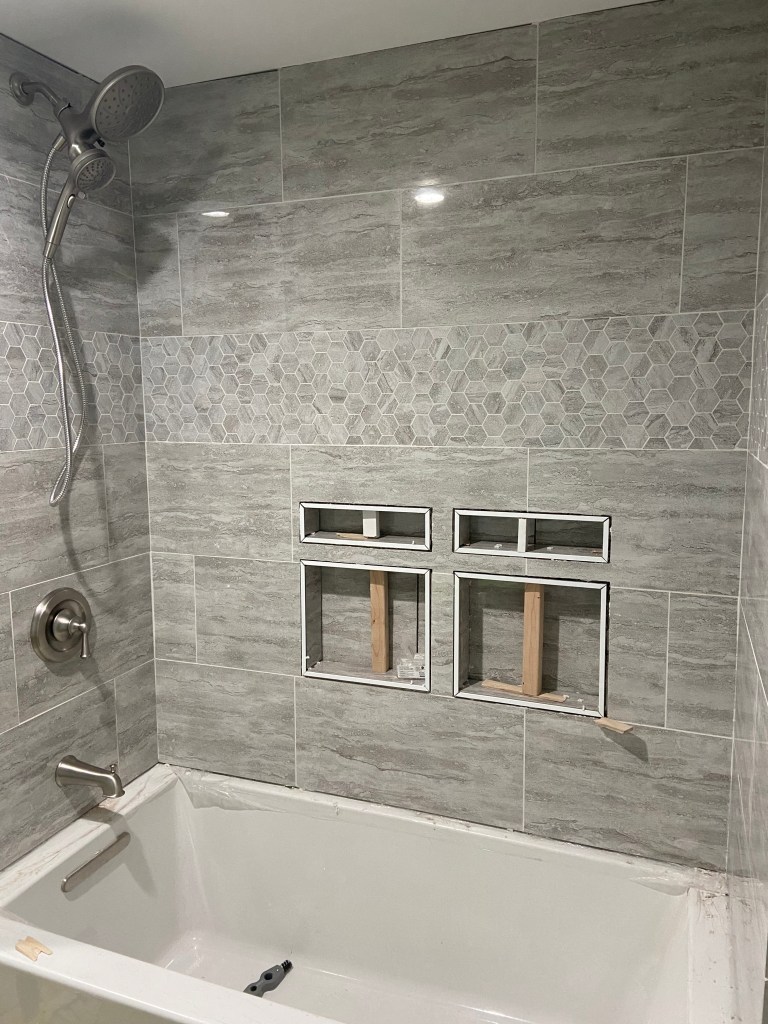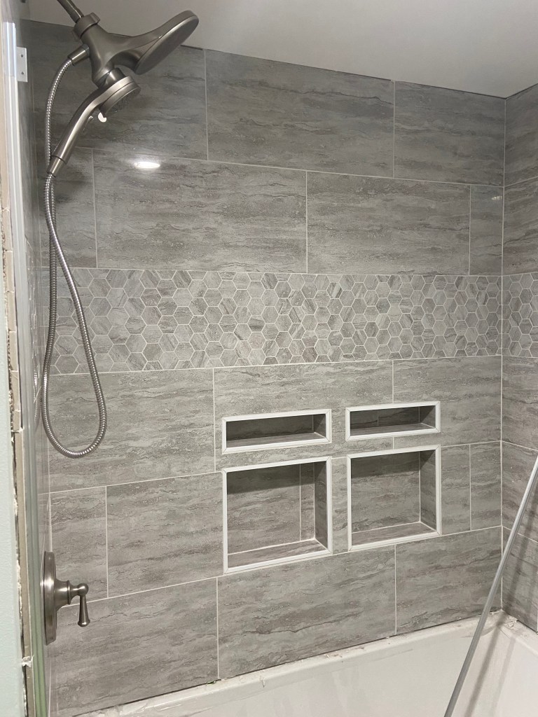 We installed flooring as soon as we finished the tub and shower installation and wow did it change the bathroom. It suddenly felt like construction in the home was finally wrapping up! Throughout this project I have been regularly excited about each process that is completed and each one we start. I think after we finished the *bare minimum* on the bathroom, I was no longer excited to start anything new. I’m hoping with a break I will get excited to start the projects we have left!