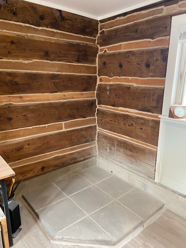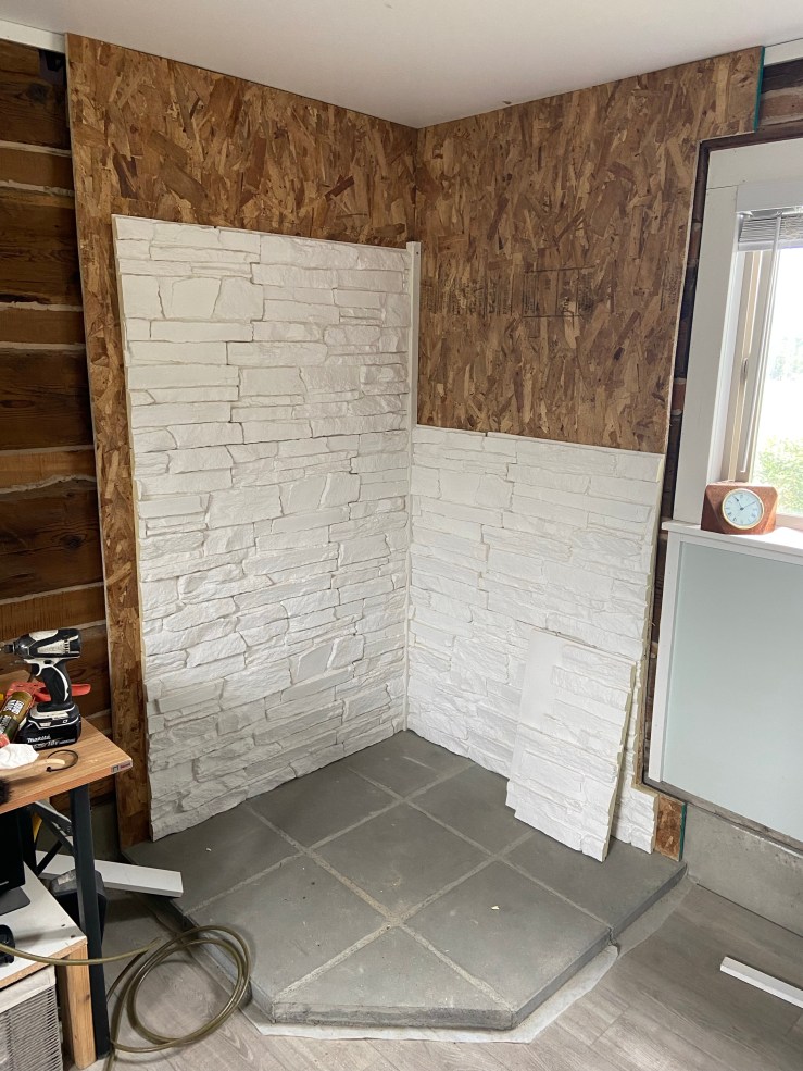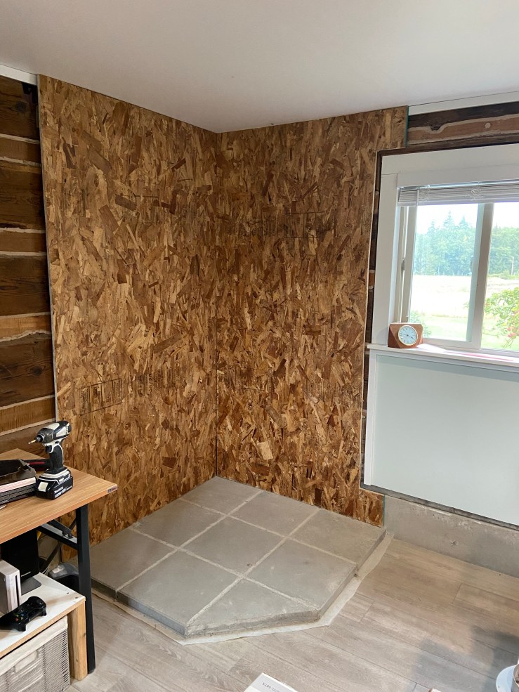 The first thing we had to do was chip off the final “bird mouth” (remnant from the foundation pour) which essentially dusted our entire home. We had been dreading that little part of the project, but once it was done we were able to push forward. Then we put up some backer to brighten up the corner, and to protect the log wall from the wood stove heat.