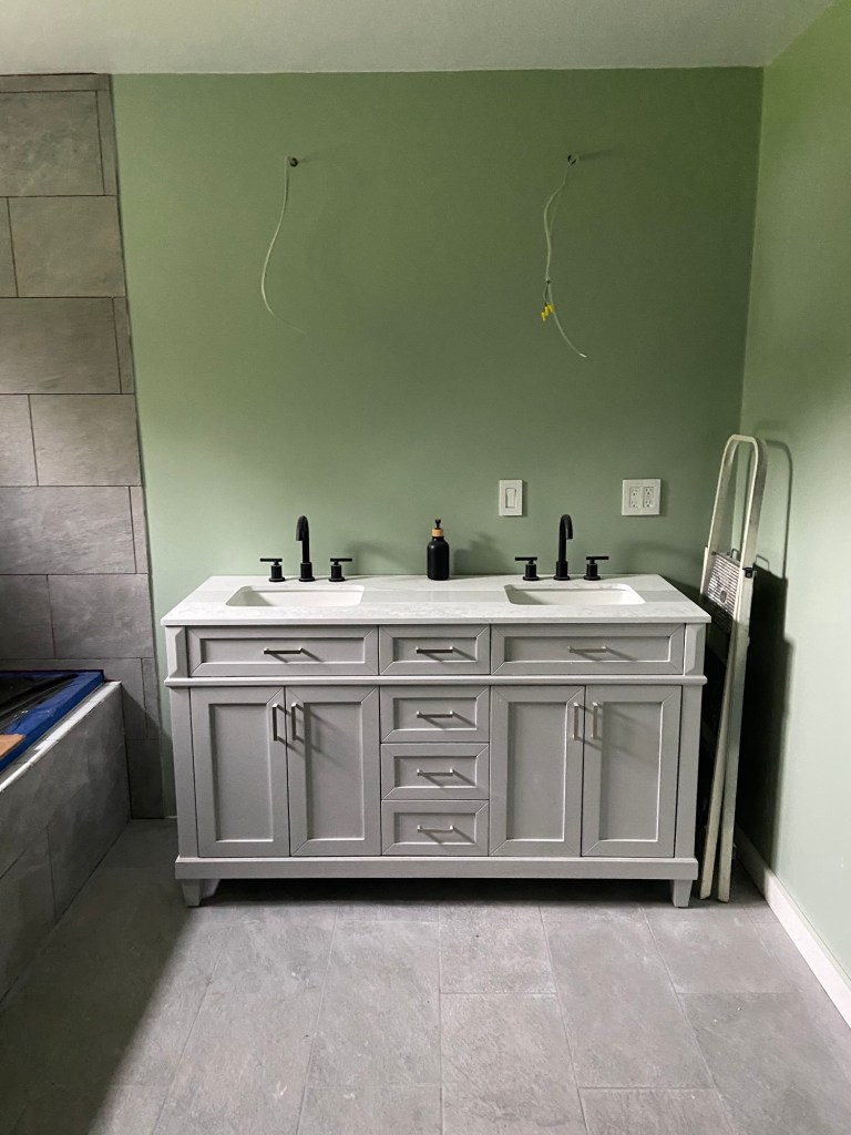 Once we learned we were pregnant again (when our first born was about one), we decided it was time to get the master bathroom done! It took months and months, construction is HARD with a toddler! But we are so happy with the completed project. It is absolutely wonderful. Being able to hop in the shower while still in earshot of the newborn in her bassinet was heaven.